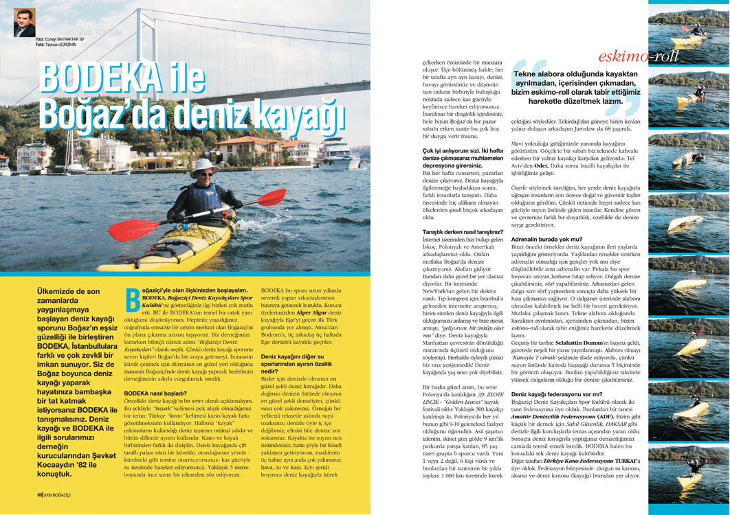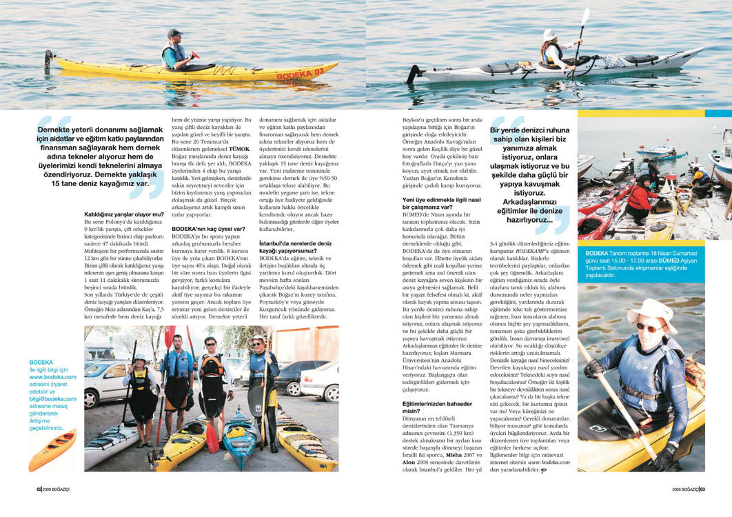 Boğaz’da deniz kayağına ilişkin bu söyleşi, Tetra İletişim tarafından, Boğaziçi Üniversitesi Mezunlar Derneği (BÜMED) için üretilen “Boğaziçi” dergisinin 138. sayısında (Mart 2009) yer aldı. Cüneyt Bayraktar tarafından gerçekleştirilen söyleşinin fotoğraflarını Teoman Gürzihin çekti. Sayfa tasarımı ve uygulaması Nur Ayman Çakmak tarafından yapıldı.