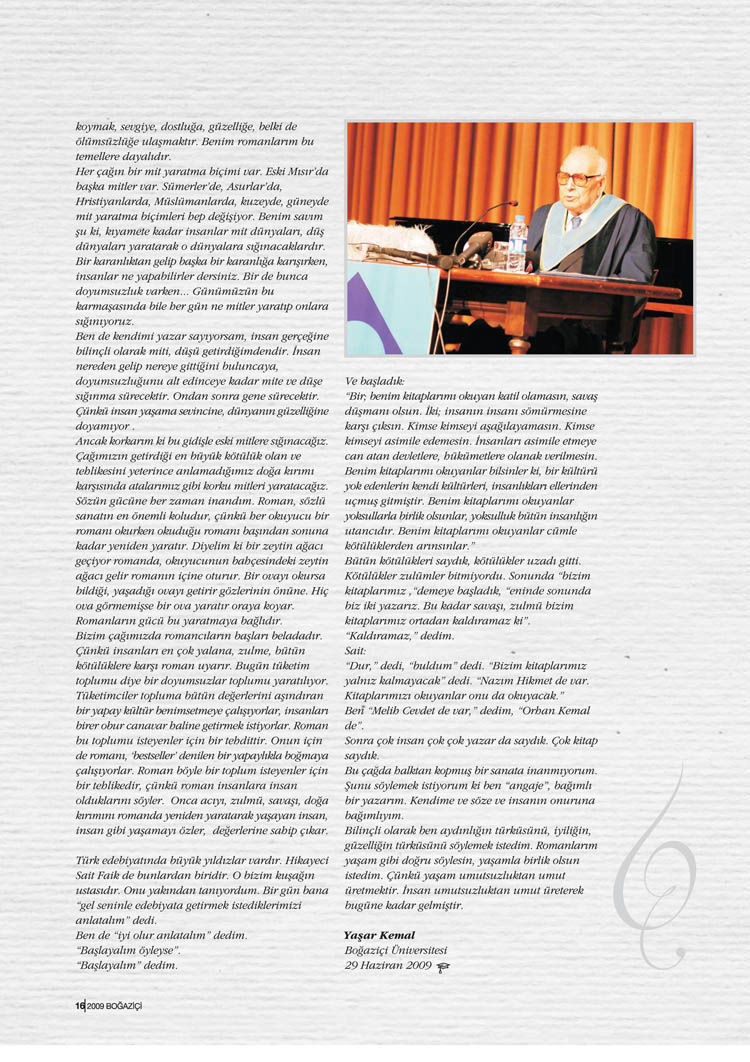Yaşar Kemal için Boğaziçi Üniversitesi’nde düzenlenen fahri doktora törenine ilişkin bu haber, Tetra İletişim tarafından, Boğaziçi Üniversitesi Mezunlar Derneği (BÜMED) için üretilen “Boğaziçi” dergisinin 142. sayısında (Temmuz – Ağustos 2009) yer aldı. Etkinlik fotoğrafları Teoman Gürzihin tarafından çekildi. Konunun sayfa tasarımı ve uygulaması Nur Ayman Çakmak tarafından yapıldı.