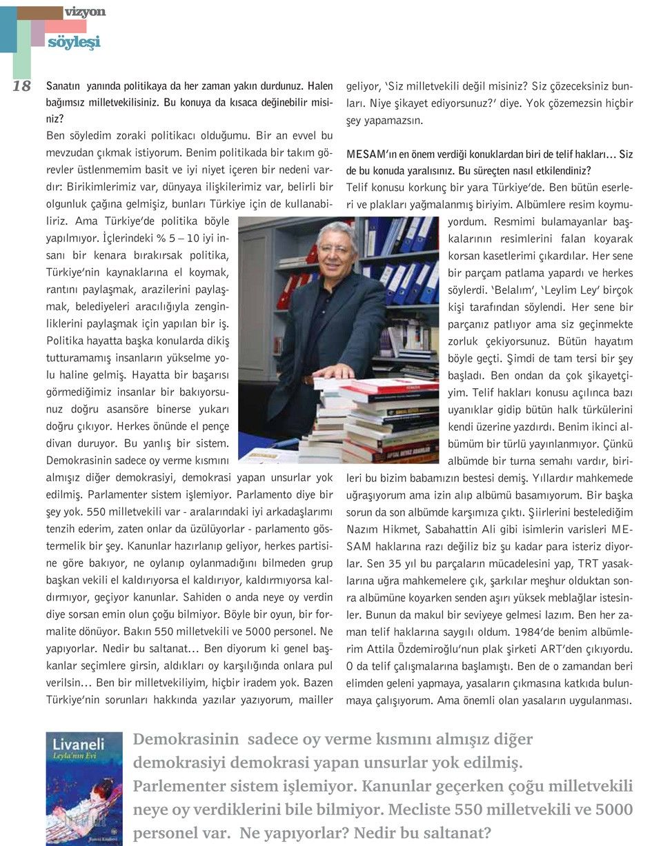 Zülfü Livaneli’yle yapılan bu söyleşi, Tetra İletişim tarafından, Türkiye Musiki Eseri Sahipleri Meslek Birliği (MESAM) için üretilen “Mesam Vizyon” dergisinin 2. sayısında (Ekim – Kasım 2006) yer aldı. Taner Koçak ve Esra Okutan tarafından gerçekleştirilen söyleşinin fotoğraflarını Sinan Kesgin çekti. Sayfa tasarımı ve uygulaması Murat Ateş tarafından yapıldı.