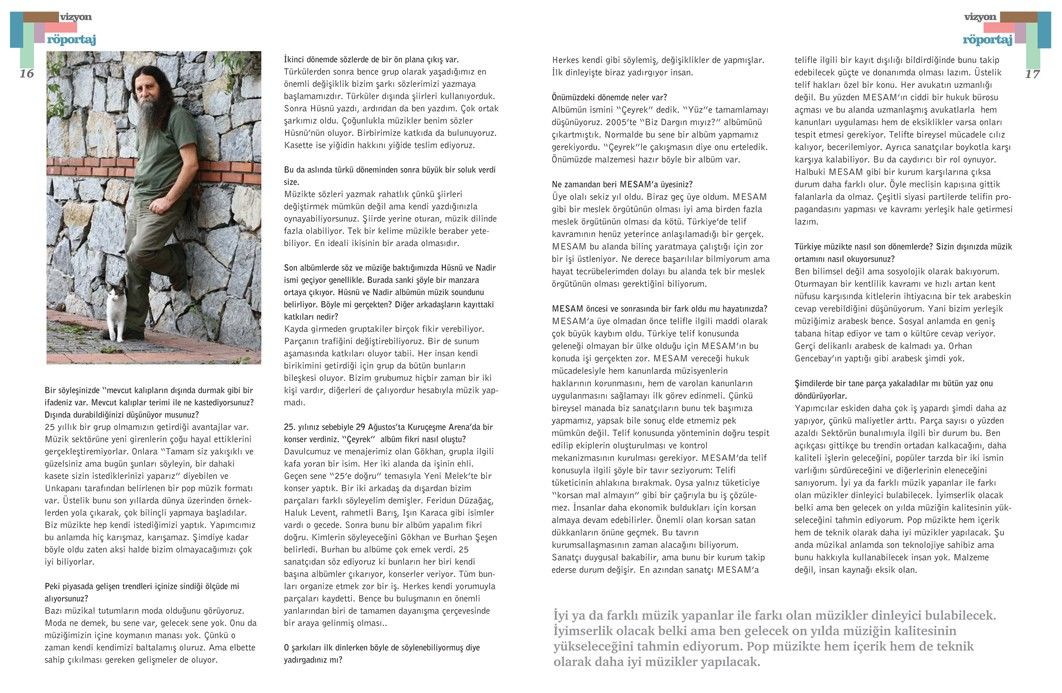 Ezginin Günlüğü’yle yapılan bu söyleşi, Tetra İletişim tarafından, Türkiye Musiki Eseri Sahipleri Meslek Birliği (MESAM) için üretilen “Mesam Vizyon” dergisinin 6. sayısında (Eylül – Ekim 2007) yer aldı. Söyleşi, Taner Koçak ve Önder Kızılkaya tarafından yapıldı. Röportaj fotoğrafları Sinan Kesgin tarafından çekildi. Diğer görseller Ezginin Günlüğü arşivinden edinildi. Sayfa tasarımı ve uygulaması Didem İncesağır tarafından yapıldı.