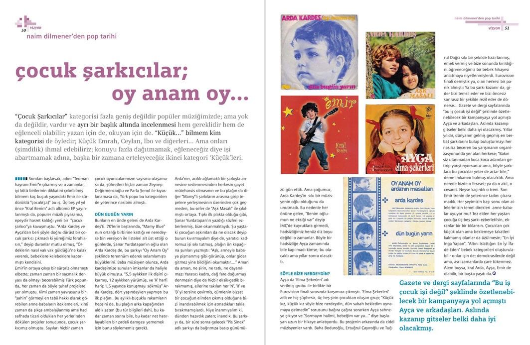 Naim Dilmener tarafından kaleme alınan “Çocuk şarkıcılar: Oy anam oy…” adlı bu yazı, Tetra İletişim tarafından, Türkiye Musiki Eseri Sahipleri Meslek Birliği (MESAM) için üretilen “Mesam Vizyon” dergisinin 7. sayısında (Aralık 2007 – Ocak 2008) yer aldı. Yazıda kullanılan görseller, Naim Dilmener’in arşivinden edinildi. Sayfa tasarımı ve uygulaması Didem İncesağır tarafından yapıldı.