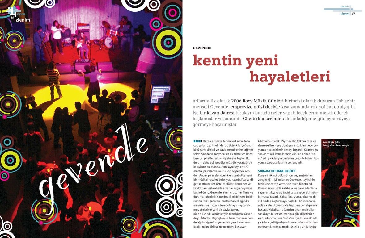 Bazen aklımıza bir melodi ama daha çok şarkı sözü takılır durur. Üstelik birçoğunun kötü şarkı sözleri ve basit melodilerine rağmen televizyonda ve radyoda sık sık tekrar edilmesi bize bir şekilde şarkıyı öğretmeye başlar. Bu durum daha çok popüler müziğin yarattığı bir kolaylıktır bu aslında. Ama aynı şeyi enstrümantal parçalar ve müzik için söylemek zordur. Ancak şu sıralar özellikle İstanbul’da yeni bir müzikal hayalet dolaşıyor. İstanbul’da ve diğer kentlerde üst üste verdikleri konserler ve katıldıkları festivallerle adlarını sıkça duymaya başladığımız Gevende isimli grup, her filme ve duruma rahatlıkla soundtrack olabilecek birbirinden farklı şarkıları, enstrümantal ağırlıklı müzikleri ve hiçbir dile ait olmayan uydurulmuş sözleriyle yeni bir sayfa açıyor.