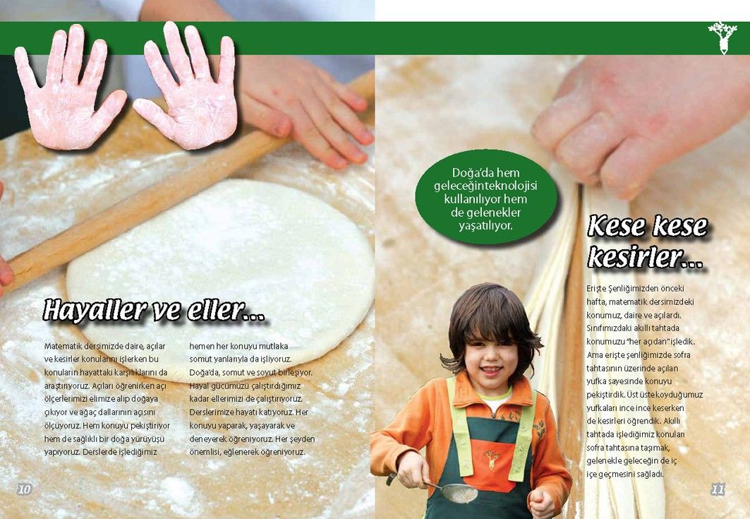 Erişte Şenliğimizden önceki hafta, matematik dersimizdeki konumuz, daire ve açılardı. Sınıfımızdaki akıllı tahtada konumuzu “her açıdan” işledik. Ama erişte şenliğimizde sofra tahtasının üzerinde açılan yufka sayesinde konuyu pekiştirdik. Üst üste koyduğumuz yufkaları ince ince keserken de kesirleri öğrendik. Akıllı tahtada işlediğimiz konuları sofra tahtasına taşımak, gelenekle geleceğin de iç içe geçmesini sağladı.