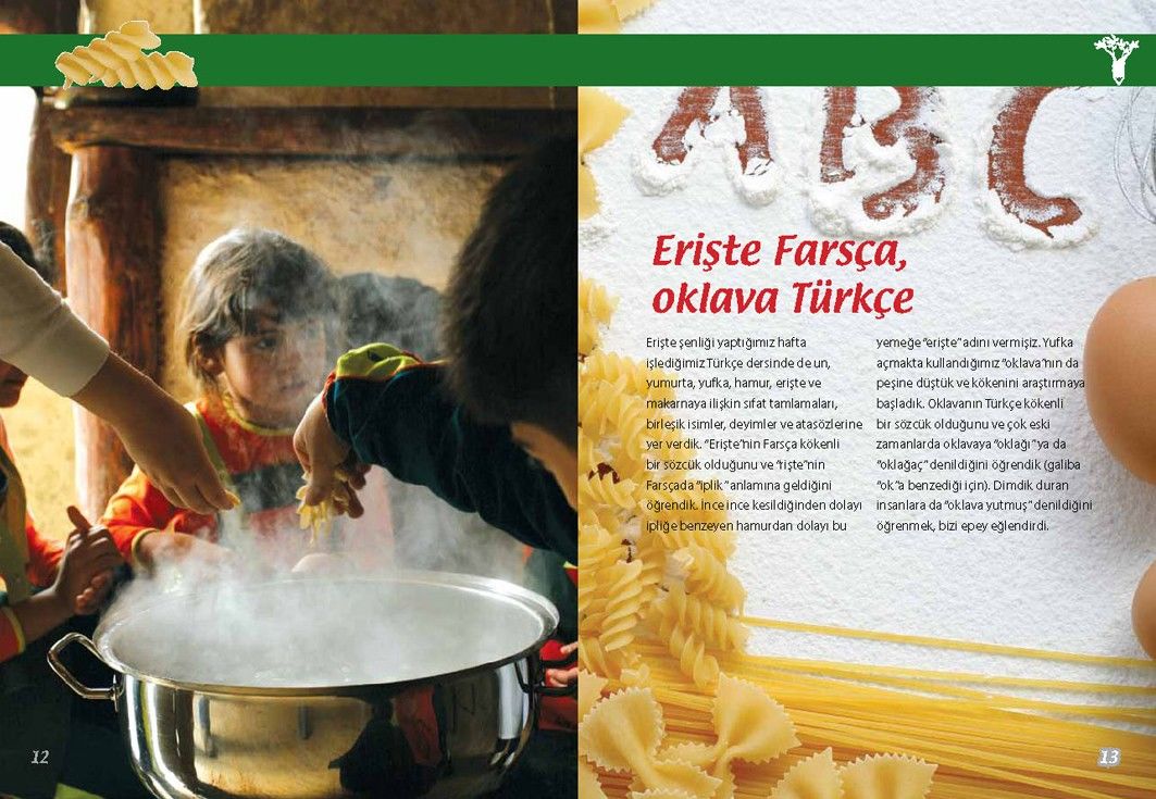 Erişte şenliği yaptığımız hafta işlediğimiz Türkçe dersinde de un, yumurta, yufka, hamur, erişte ve makarnaya ilişkin sıfat tamlamaları, birleşik isimler, deyimler ve atasözlerine yer verdik. “Erişte”nin Farsça kökenli bir sözcük olduğunu ve “rişte”nin Farsçada “iplik” anlamına geldiğini öğrendik. İnce ince kesildiğinden dolayı ipliğe benzeyen hamurdan dolayı bu yemeğe “erişte” adını vermişiz. Yufka açmakta kullandığımız “oklava”nın da peşine düştük ve kökenini araştırmaya başladık. Oklavanın Türkçe kökenli bir sözcük olduğunu ve çok eski zamanlarda oklavaya “oklağı” ya da “oklağaç” denildiğini öğrendik (galiba “ok”a benzediği için). Dimdik duran insanlara da “oklava yutmuş” denildiğini öğrenmek, bizi epey eğlendirdi.
