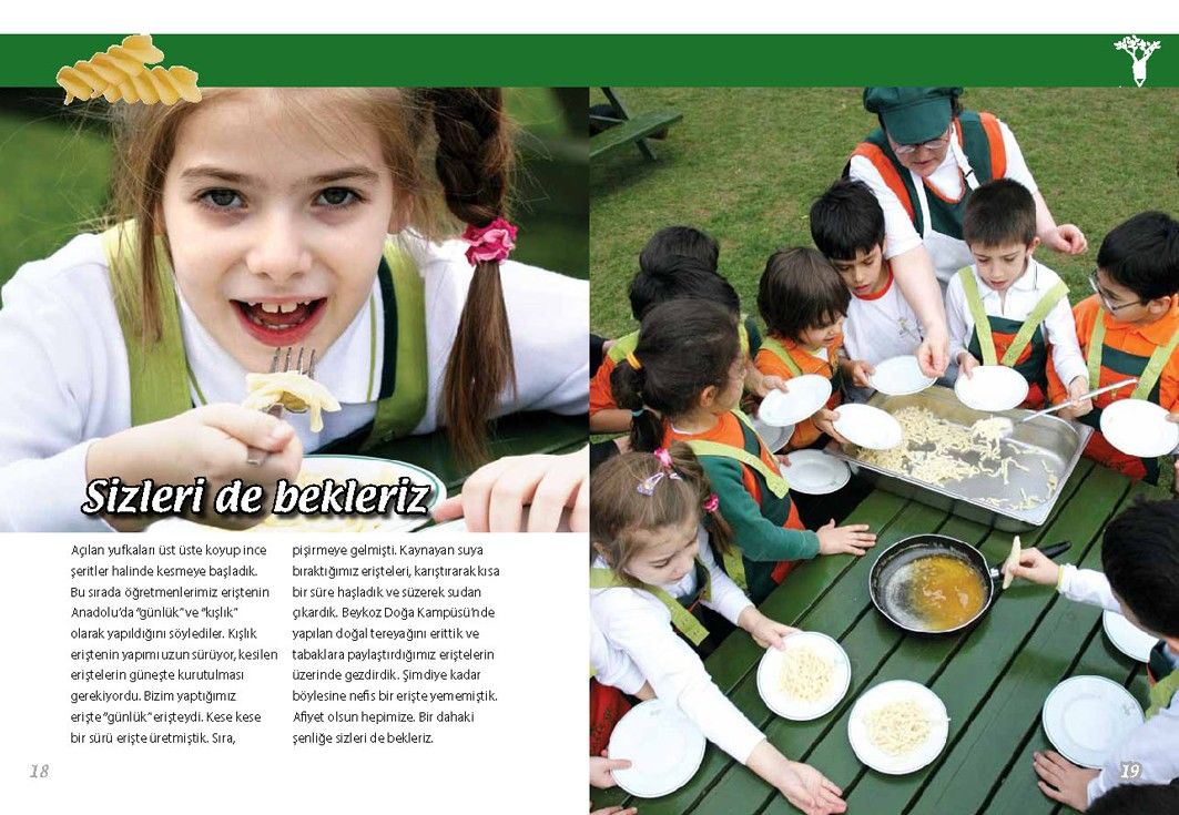 Açılan yufkaları üst üste koyup ince şeritler halinde kesmeye başladık. Bu sırada öğretmenlerimiz eriştenin Anadolu’da “günlük” ve “kışlık” olarak yapıldığını söylediler. Kışlık eriştenin yapımı uzun sürüyor, kesilen eriştelerin güneşte kurutulması gerekiyordu. Bizim yaptığımız erişte “günlük” erişteydi. Kese kese bir sürü erişte üretmiştik. Sıra, pişirmeye gelmişti. Kaynayan suya bıraktığımız erişteleri, karıştırarak kısa bir süre haşladık ve süzerek sudan çıkardık. Beykoz Doğa Kampüsü’nde yapılan doğal tereyağını erittik ve tabaklara paylaştırdığımız eriştelerin üzerinde gezdirdik. Şimdiye kadar böylesine nefis bir erişte yememiştik. Afiyet olsun hepimize. Bir dahaki şenliğe sizleri de bekleriz.