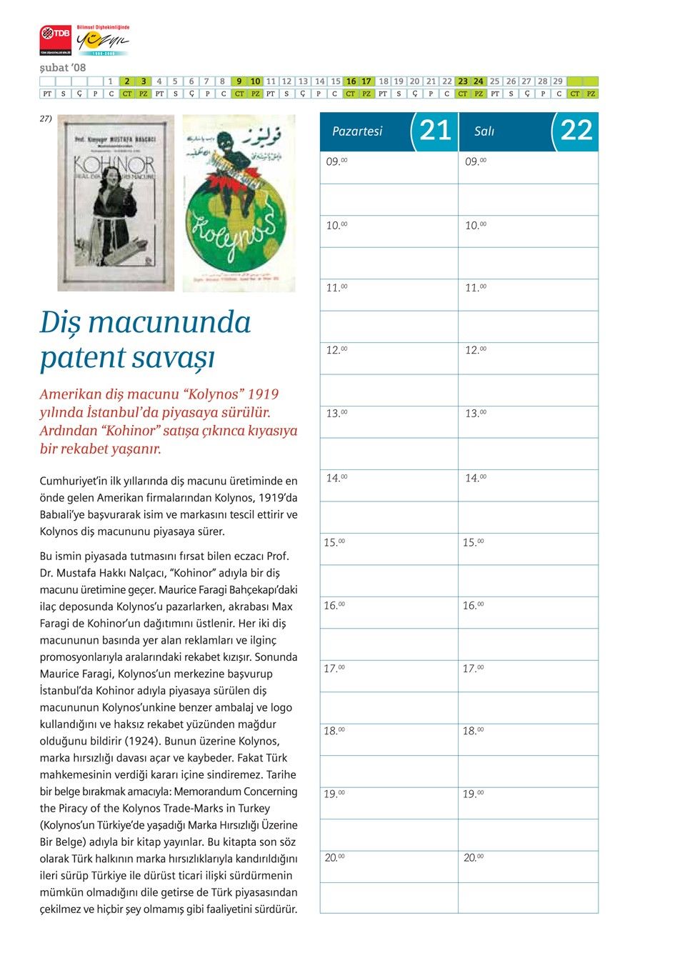 2008, Türkiye’de bilimsel dişhekimliğinin 100. yılıydı. Tetra İletişim bu vesileyle TDB (Türk Dişhekimleri Birliği) için bir ajanda hazırladı. “Bilimsel Dişhekimliğinin 100. Yılında Meslek Tarihine Bakış” adını taşıyan bu ajandanın içinde yer alan konuların araştırılması, metin yazımı ve görsel temini Prof. Dr. Nuran Yıldırım (İstanbul Tıp Fakültesi Deontoloji ve Tıp Tarihi Anabilim Dalı Öğretim Üyesi) tarafından gerçekleştirildi. Projenin koordinasyonundaysa Tetra İletişim’den Şebnem Akçıl, Türkşan Karatekin ve Önder Kızılkaya yer aldı. Ajandanın tasarım ve uygulamasını Didem İncesağır yaptı. Baskısıysa Punto Baskı Çözümleri tarafından gerçekleştirildi. Yaklaşık 20.000 adet basılan ajanda Türkiye’deki tüm dişhekimlerine dağıtıldı.