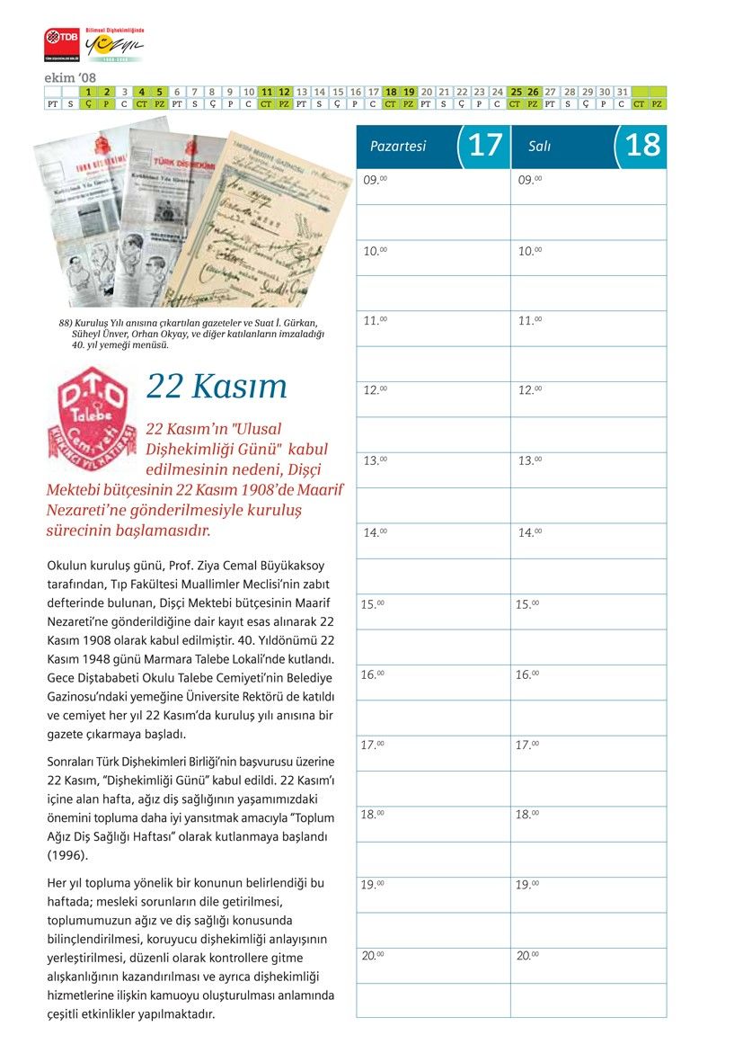 2008, Türkiye’de bilimsel dişhekimliğinin 100. yılıydı. Tetra İletişim bu vesileyle TDB (Türk Dişhekimleri Birliği) için bir ajanda hazırladı. “Bilimsel Dişhekimliğinin 100. Yılında Meslek Tarihine Bakış” adını taşıyan bu ajandanın içinde yer alan konuların araştırılması, metin yazımı ve görsel temini Prof. Dr. Nuran Yıldırım (İstanbul Tıp Fakültesi Deontoloji ve Tıp Tarihi Anabilim Dalı Öğretim Üyesi) tarafından gerçekleştirildi. Projenin koordinasyonundaysa Tetra İletişim’den Şebnem Akçıl, Türkşan Karatekin ve Önder Kızılkaya yer aldı. Ajandanın tasarım ve uygulamasını Didem İncesağır yaptı. Baskısıysa Punto Baskı Çözümleri tarafından gerçekleştirildi. Yaklaşık 20.000 adet basılan ajanda Türkiye’deki tüm dişhekimlerine dağıtıldı.