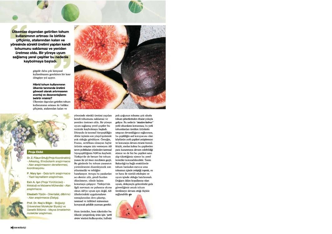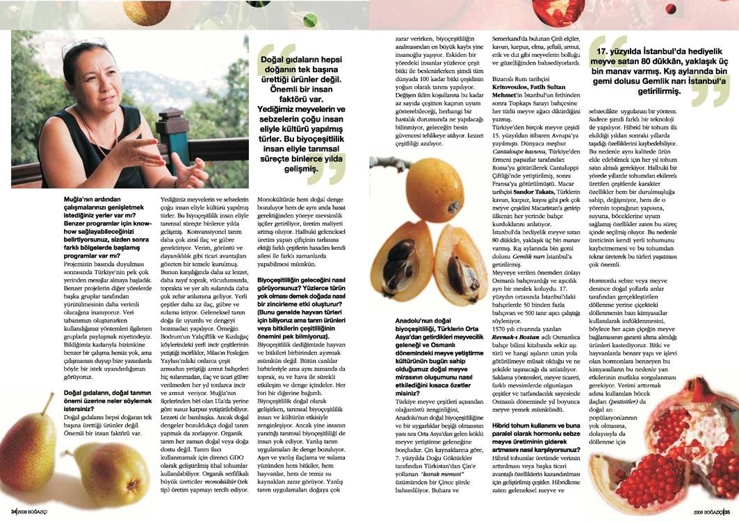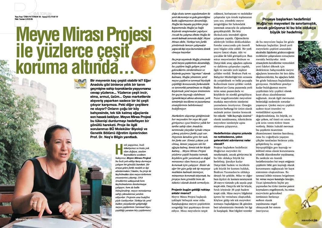 Meyve mirası projesine ilişkin bu söyleşi, Tetra İletişim tarafından, Boğaziçi Üniversitesi Mezunlar Derneği (BÜMED) için üretilen “Boğaziçi” dergisinin 133. sayısında (Ekim 2008) yer aldı. Pınar Türen ve Ayşegül Zülfikar tarafından gerçekleştirilen söyleşinin fotoğraflarını Teoman Gürzihin çekti. Sayfa tasarımı ve uygulaması Nur Ayman Çakmak tarafından yapıldı.