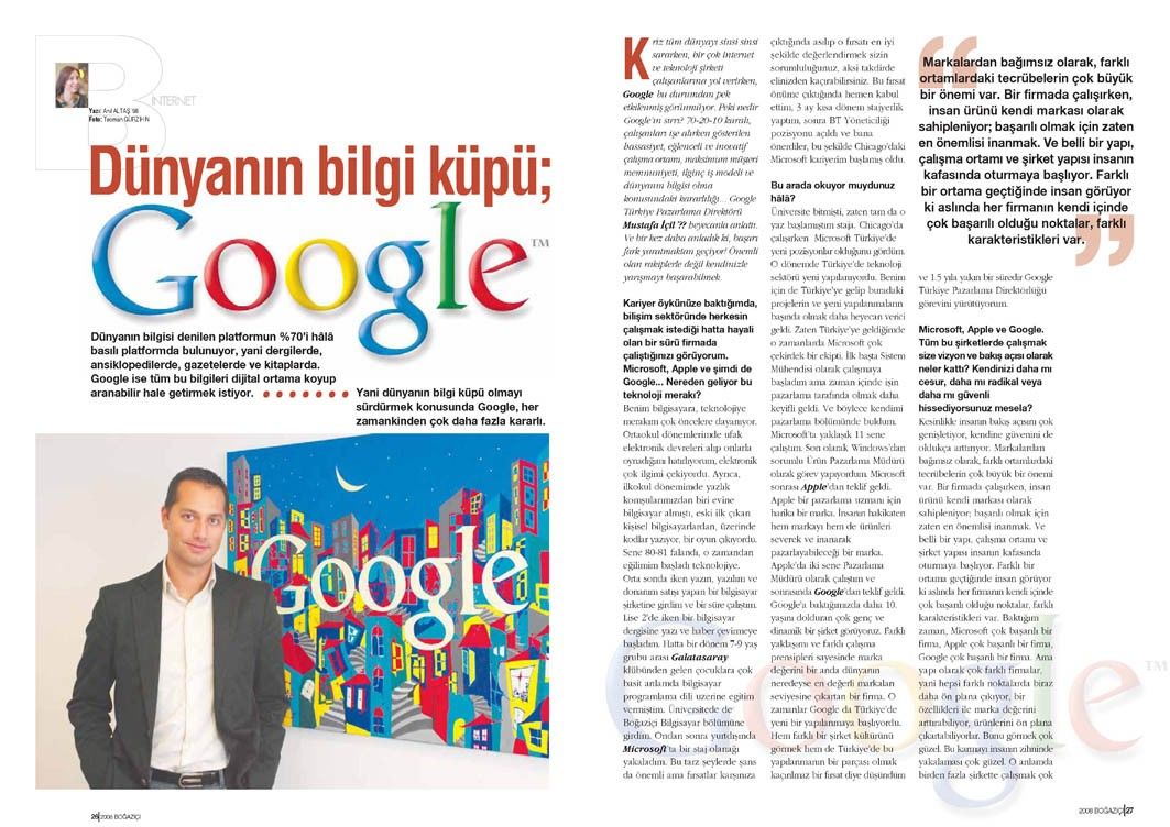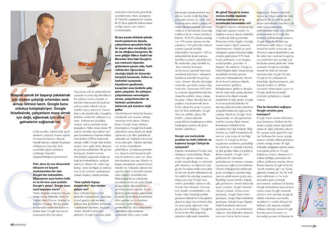Google’ın diğer internet şirketlerinden çok daha farklı bir anlayışı var. Bir çok şirketin amacı kullanıcı benim siteme gelsin, benim sitemde mümkün olduğunca çok vakit geçirsin. Bu önemli bir başarı kriteri sayılıyor. Google’ın arama motorundaki mantık ise tamamen ters! Kullanıcı bizim sayfamızda ne kadar az kalırsa o kadar başarılıyız demektir, çünkü çok kalıyorsa aradığını bulamadı demektir. Ben bir çok işimi internet platformunda yapıyorum. Bilgilerimin çoğunu Google platformunda tutuyorum. Cep telefonumdan da sürekli internete bağlıyım. İnternette alışveriş, Türkiye’de de çok hızla gelişmekte olan bir platform ve ben de internet üzerinden çok fazla alışveriş yaparım. Google News üzerinden haberlere ulaşıyorum.
