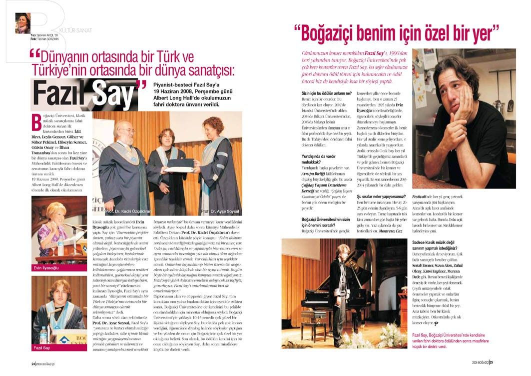Fazıl Say’la yapılan bu söyleşi, Tetra İletişim tarafından, Boğaziçi Üniversitesi Mezunlar Derneği (BÜMED) için üretilen “Boğaziçi” dergisinin 131. sayısında (Temmuz – Ağustos 2008) yer aldı. Şebnem Akçıl tarafından gerçekleştirilen söyleşinin fotoğraflarını Teoman Gürzihin çekti. Sayfa tasarımı ve uygulaması Nur Ayman Çakmak tarafından yapıldı.