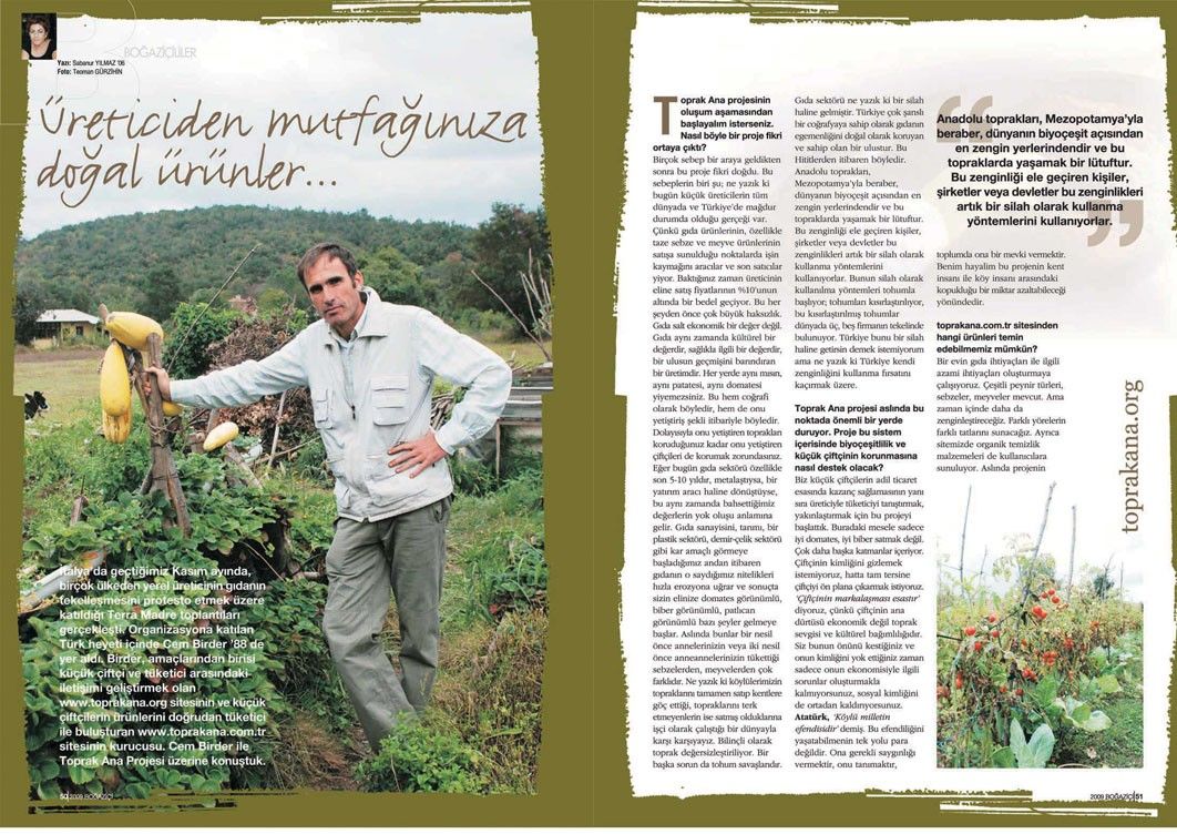 Birder, amaçlarından birisi küçük çiftçi ve tüketici arasındaki iletişimi geliştirmek olan www.toprakana.org sitesinin ve küçük çiftçilerin ürünlerini doğrudan tüketici ile buluşturan www.toprakana.com.tr sitesinin kurucusu. Cem Birder ile toprak ana projesi üzerine konuştuk.