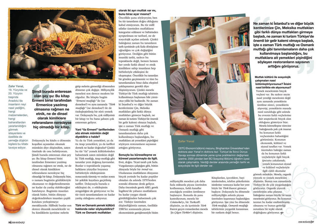 Ermeni mutfağı üzerine Zafer Yenal’la yapılan bu söyleşi, Tetra İletişim tarafından, Boğaziçi Üniversitesi Mezunlar Derneği (BÜMED) için üretilen “Boğaziçi” dergisinin 136. sayısında (Ocak 2009) yer aldı. Ayşegül Zülfikar tarafından gerçekleştirilen söyleşinin fotoğraflarını Teoman Gürzihin çekti. Sayfa tasarımı ve uygulaması Nur Ayman Çakmak tarafından yapıldı.