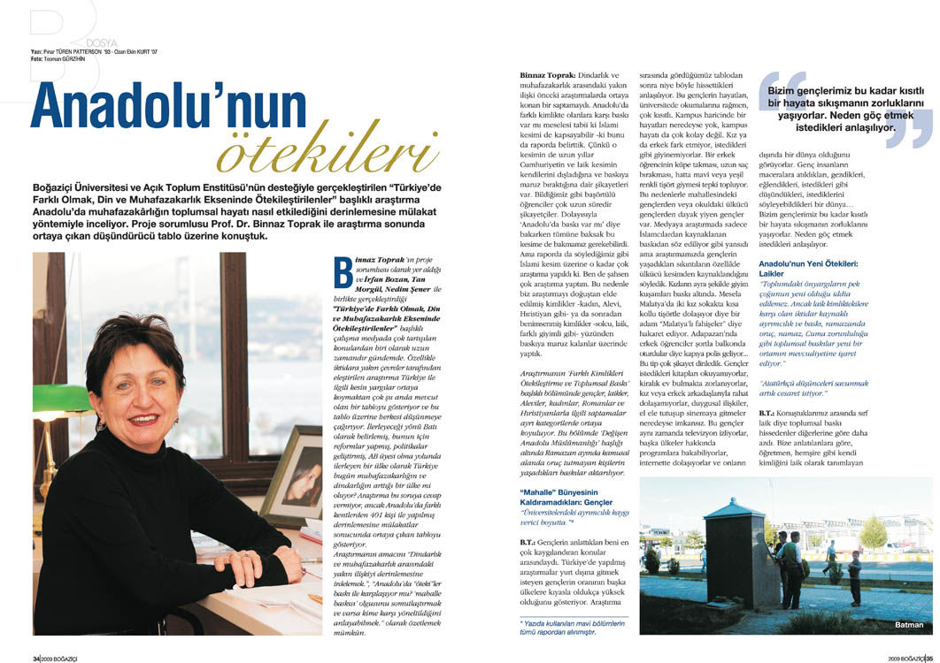 Binnaz Toprak’la yapılan bu söyleşi , Tetra İletişim tarafından, Boğaziçi Üniversitesi Mezunlar Derneği (BÜMED) için üretilen “Boğaziçi” dergisinin 137. sayısında (Şubat 2009) yer aldı. Pınar Türen ve Ozan Ekin Kurt tarafından gerçekleştirilen söyleşinin fotoğraflarını Teoman Gürzihin çekti. Sayfa tasarımı ve uygulaması Nur Ayman Çakmak tarafından yapıldı.