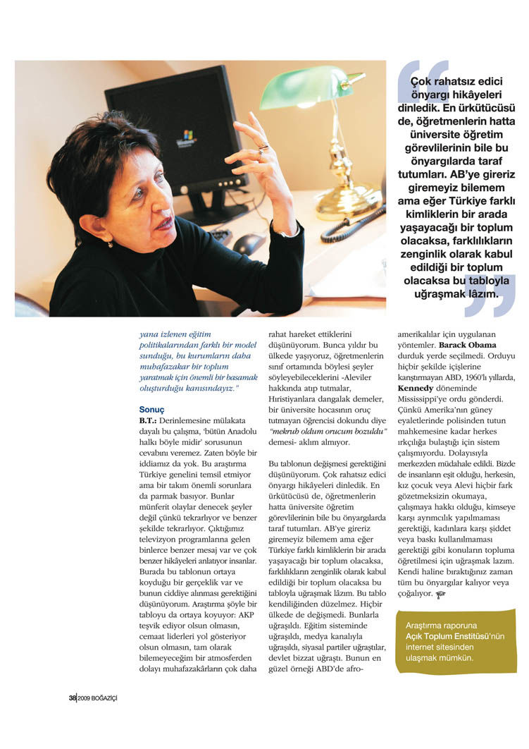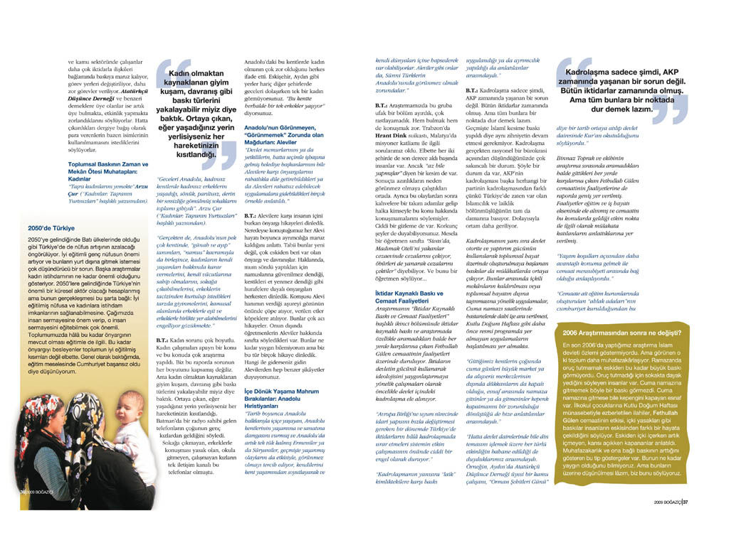 B.T.: Derinlemesine mülakata dayalı bu çalışma, ‘bütün Anadolu halkı böyle midir’ sorusunun cevabını veremez. Zaten böyle bir iddiamız da yok. Bu araştırma Türkiye genelini temsil etmiyor ama bir takım önemli sorunlara da parmak basıyor. Bunlar münferit olaylar denecek şeyler değil çünkü tekrarlıyor ve benzer şekilde tekrarlıyor. Çıktığımız televizyon programlarına gelen binlerce benzer mesaj var ve çok benzer hikayeleri anlatıyor insanlar. Burada bu tablonun ortaya koyduğu bir gerçeklik var ve bunun ciddiye alınması gerektiğini düşünüyorum. Araştırma şöyle bir tabloyu da ortaya koyuyor: AKP teşvik ediyor olsun olmasın, cemaat liderleri yol gösteriyor olsun olmasın, tam olarak bilemeyeceğim bir atmosferden dolayı muhafazakarların çok daha rahat hareket ettiklerini düşünüyorum. Bunca yıldır bu ülkede yaşıyoruz, öğretmenlerin sınıf ortamında böylesi şeyler söyleyebileceklerini –Aleviler hakkında atıp tutmalar, Hıristiyanlara dangalak demeler, bir üniversite hocasının oruç tutmayan öğrencisi dokundu diye “mekruh oldum orucum bozuldu” demesi- aklım almıyor.