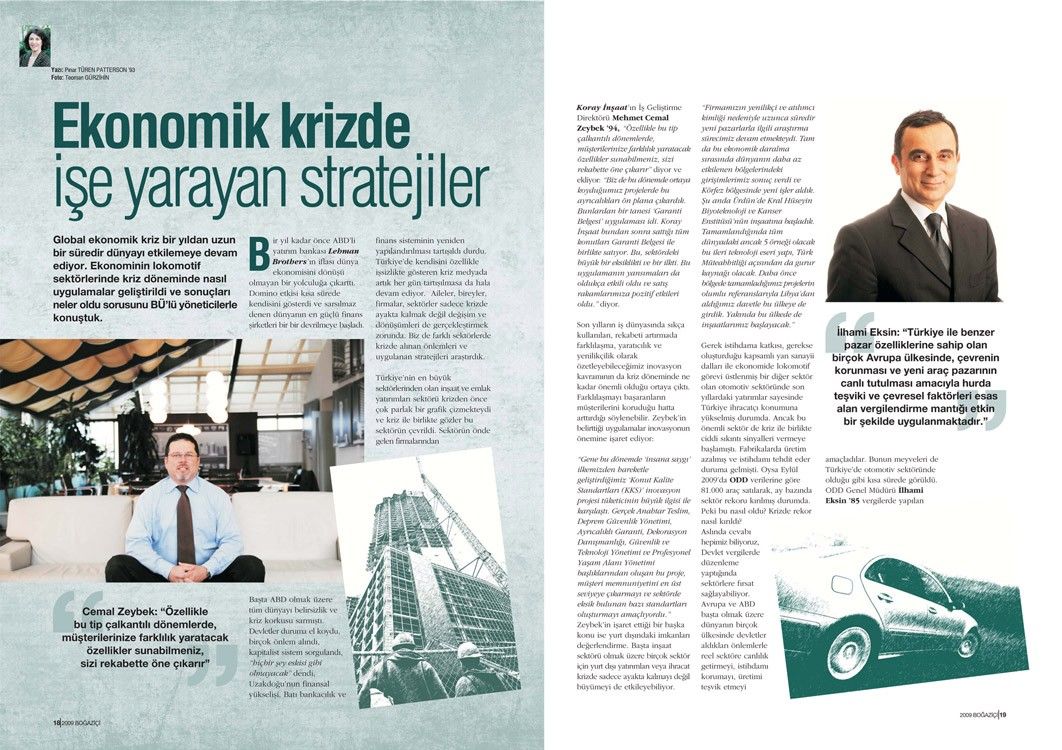 Görülüyor ki krizde özellikle Devlet tarafından alınan vergi veya istihdama yönelik uygulamalar (ÖTV indirimi, istihdama vergi indirimi gibi) sektörlere önemli ivme kazandırabiliyor ve geçiş sürecinde bir rahatlama sağlayabiliyor. Ancak firmaların ve ekonomideki tüm aktörlerin de kendilerini yenileyebilmeleri, doğru stratejileri zaman kaybetmeden hayata geçirebilmeleri gerekiyor.Global ekonomik kriz bir yıldan uzun bir süredir dünyayı etkilemeye devam ediyor. Ekonominin lokomotif sektörlerinde kriz döneminde nasıl uygulamalar geliştirildi ve sonuçları neler oldu sorusunu BÜ’lü yöneticilerle konuştuk.