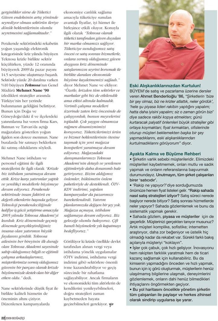 “Ekonomik krizde işe yarayan stratejiler” adlı bu yazı, Tetra İletişim tarafından, Boğaziçi Üniversitesi Mezunlar Derneği (BÜMED) için üretilen “Boğaziçi” dergisinin 146. sayısında (Aralık 2009) yer aldı. Pınar Türen tarafından kaleme alınan yazıdaki fotoğraflar Teoman Gürzihin’e ait. Sayfa tasarımı ve uygulaması Nur Ayman Çakmak tarafından yapıldı.