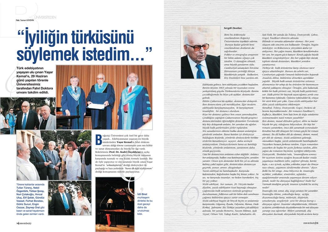 Yaşar Kemal için Boğaziçi Üniversitesi’nde düzenlenen fahri doktora törenine ilişkin bu haber, Tetra İletişim tarafından, Boğaziçi Üniversitesi Mezunlar Derneği (BÜMED) için üretilen “Boğaziçi” dergisinin 142. sayısında (Temmuz – Ağustos 2009) yer aldı. Etkinlik fotoğrafları Teoman Gürzihin tarafından çekildi. Konunun sayfa tasarımı ve uygulaması Nur Ayman Çakmak tarafından yapıldı.