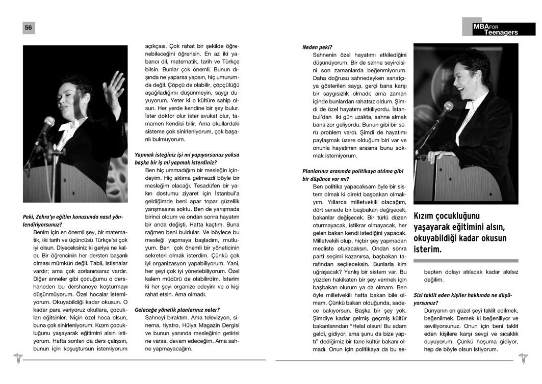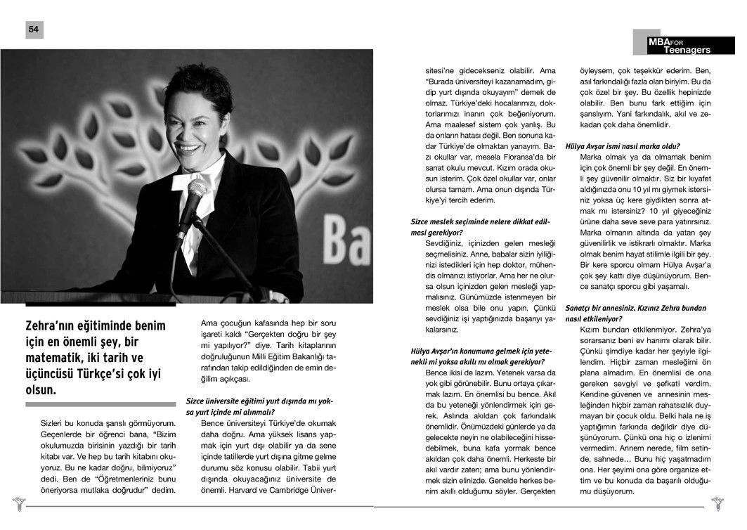 Benim için en önemli şey, bir matematik, iki tarih ve üçüncüsü Türkçe’si çok iyi olsun. Diyeceksiniz ki geriye ne kaldı. Bir öğrencinin her dersten başarılı olması mümkün değil. Tabii, istisnalar vardır; ama çok zorlanırsanız vardır. Diğer anneler gibi çocuğumu o dershaneden bu dershaneye koşturmayı düşünmüyorum. Özel hocalar istemiyorum. Okuyabildiği kadar okusun. O kadar para veriyoruz okullara, çocukları eğitsinler. Niçin özel hoca olsun, buna çok sinirleniyorum. Kızım çocukluğunu yaşayarak eğitimini alsın istiyorum. Hafta sonları da ders çalışsın, bunun için koşuştursun istemiyorum açıkçası. Çok rahat bir şekilde öğrenebileceğini öğrensin. En az iki yabancı dil, matematik, tarih ve Türkçe bilsin. Bunlar çok önemli. Bunun dışında ne yaparsa yapsın, hiç umurumda değil. Çöpçü de olabilir, çöpçülüğü aşağıladığımı düşünmeyin, saygı duyuyorum. Yeter ki o kültüre sahip olsun. Her yerde kendine bir şey bulur. ister doktor olur ister avukat olur, tamamen kendisi bilir. Ama okullardaki sisteme çok sinirleniyorum, çok başarılı bulmuyorum.