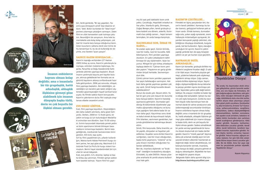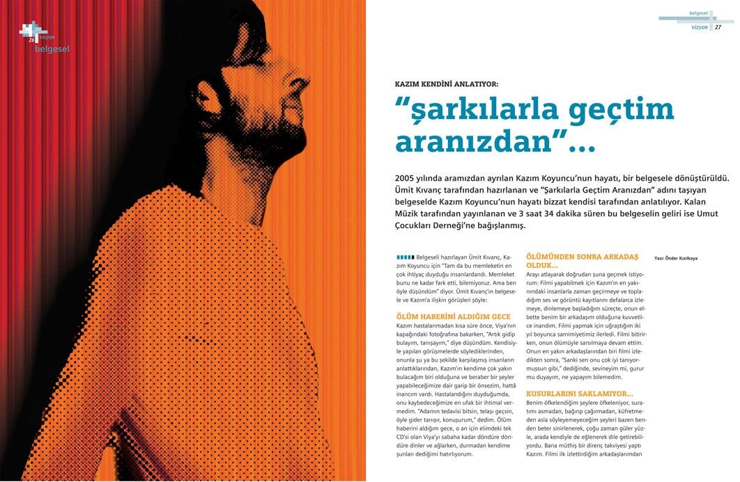 Ümit Kıvanç’la “Şarkılarla Geçtim Aranızdan” adıyla çekmiş olduğu Kazım Koyuncu belgeseline ilişkin yapılan bu söyleşi, Tetra İletişim tarafından, Türkiye Musiki Eseri Sahipleri Meslek Birliği (MESAM) için üretilen “Mesam Vizyon” dergisinin 8. sayısında (Mart – Nisan 2008) yer aldı. Önder Kızılkaya tarafından gerçekleştirilen söyleşinin fotoğraflarını Teoman Gürzihin çekti. Sayfa tasarımı ve uygulaması Didem İncesağır tarafından yapıldı.