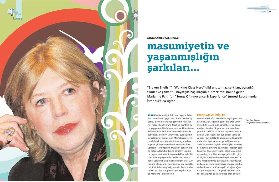 Esra Okutan tarafından kaleme alınan “Marianne Faithfull: Masumiyetin ve yaşanmışlığın şarkıları…” adlı bu yazı, Tetra İletişim tarafından, Türkiye Musiki Eseri Sahipleri Meslek Birliği (MESAM) için üretilen “Mesam Vizyon” dergisinin 8. sayısında (Mart – Nisan 2008) yer aldı. Yazıda kullanılan görseller, internetten ve Esra Okutan’ın arşivinden edinildi. Sayfa tasarımı ve uygulaması Didem İncesağır tarafından yapıldı.