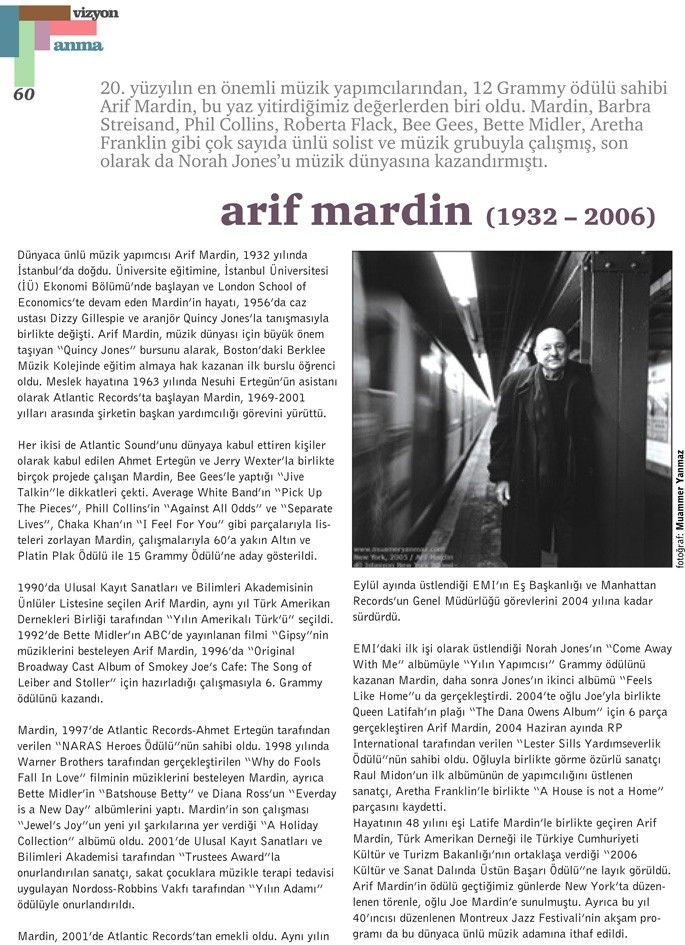 20. yüzyılın en önemli müzik yapımcılarından Arif Mardin’in ölümü üzerine kaleme alınan bu yazı, Mesam Vizyon dergisinin 1. sayısında (Ağustos – Eylül 2006) yayınlandı.