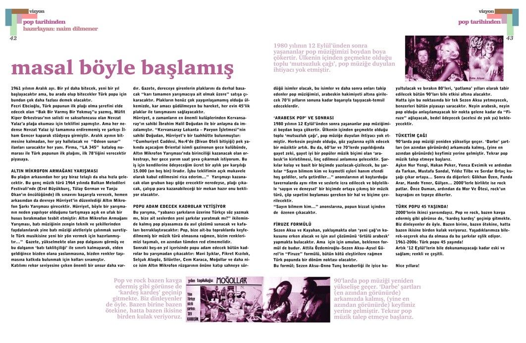 2000’lerin ikinci yarısındayız. Pop ve rock, bazen kavga edermiş gibi görünse de, ‘kardeş kardeş’ geçinip gitmekte. Biz dinleyenler de öyle. Bazen birine, bazen ötekine, hatta bazen ikisine birden kulak veriyoruz. Yaşadıklarımıza bilerek seçerek olsa da olmasa da bu şarkılar eşlik ediyor. 1961-2006: Türk popu 45 yaşında! Artık ’12 Eylül’lerin bile dokunamayacağı kadar eski ve sağlam; renkli ve çeşitli…
