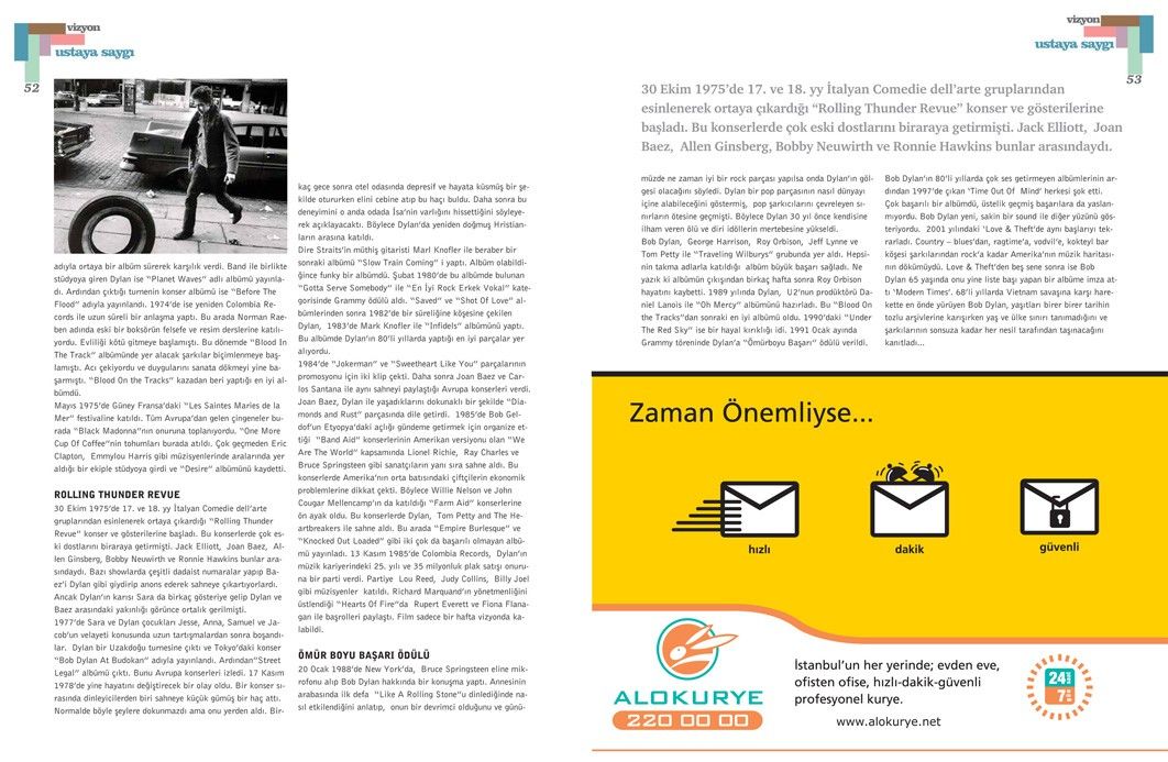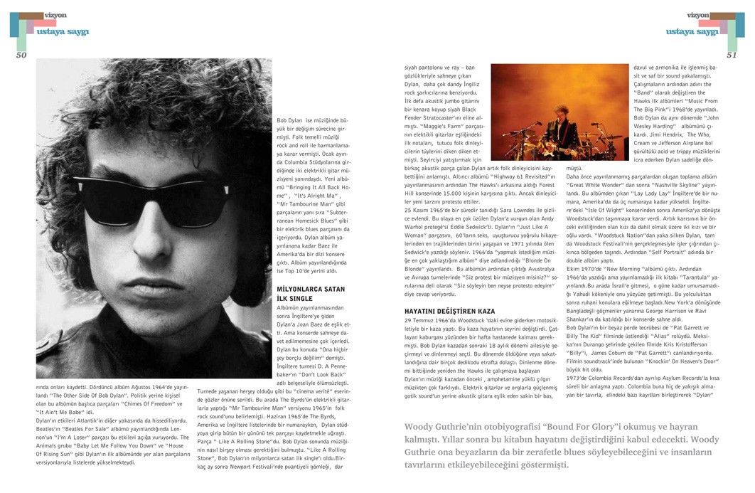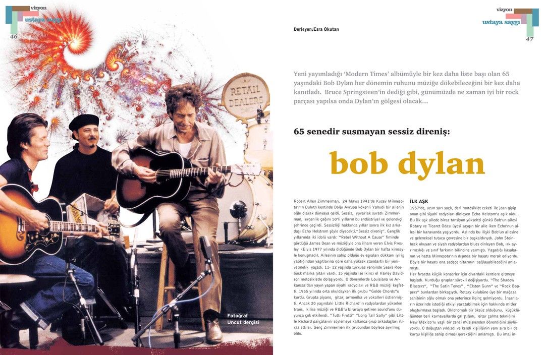 Bob Dylon hakkındaki bu yazı, Tetra İletişim tarafından, Türkiye Musiki Eseri Sahipleri Meslek Birliği (MESAM) için üretilen “Mesam Vizyon” dergisinin 2. sayısında (Ekim – Kasım 2006) yer aldı. Esra Okutan tarafından derlenen yazının görselleri Uncut dergisinden edinildi. Sayfa tasarımı ve uygulaması Murat Ateş tarafından yapıldı.