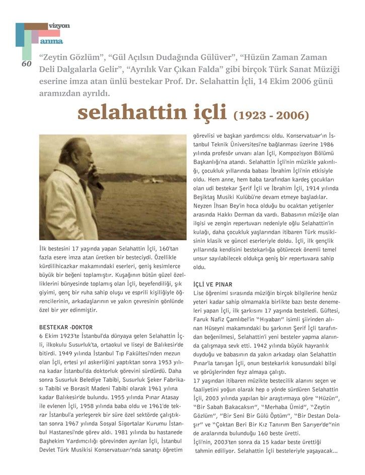 Selahattin İçli’nin vefatı üzerine kaleme alınan bu yazı, Tetra İletişim tarafından, Türkiye Musiki Eseri Sahipleri Meslek Birliği (MESAM) için üretilen “Mesam Vizyon” dergisinin 2. sayısında (Ekim – Kasım 2006) yer aldı.