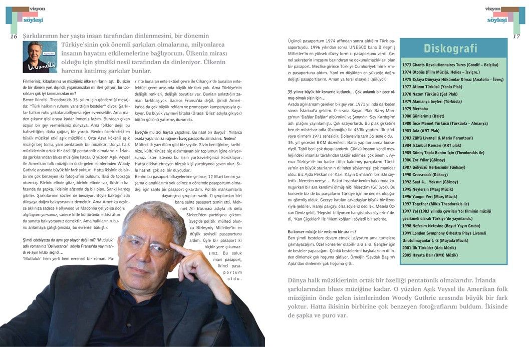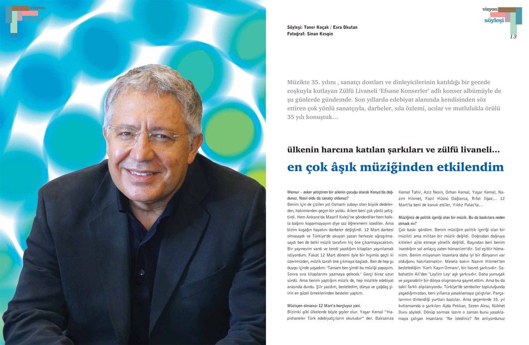Zülfü Livaneli’yle yapılan bu söyleşi, Tetra İletişim tarafından, Türkiye Musiki Eseri Sahipleri Meslek Birliği (MESAM) için üretilen “Mesam Vizyon” dergisinin 2. sayısında (Ekim – Kasım 2006) yer aldı. Taner Koçak ve Esra Okutan tarafından gerçekleştirilen söyleşinin fotoğraflarını Sinan Kesgin çekti. Sayfa tasarımı ve uygulaması Murat Ateş tarafından yapıldı.