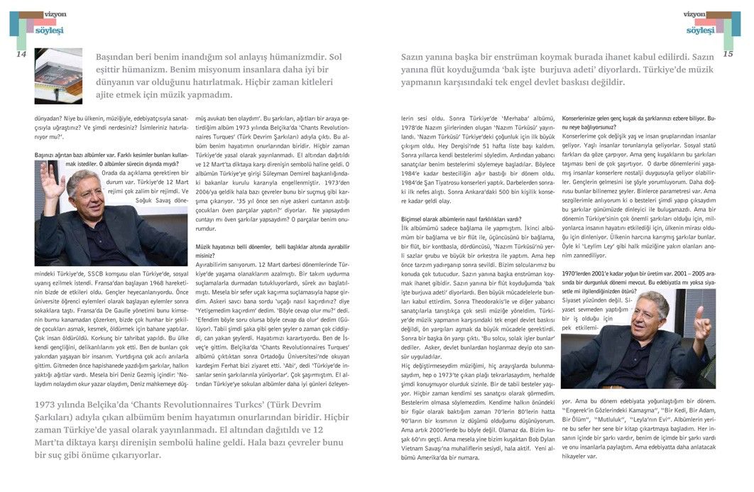 can yakan şeylerdi. Hayatımızı karartıyordu. Ben de İsveç’e gittim. Belçika’da ‘Chants Revolutionnaires Turques’ albümü çıktıktan sonra Ortadoğu Üniversitesi’nde okuyan kardeşim Ferhat bizi ziyaret etti. ‘Abi’, dedi ‘Türkiye’de insanlar senin şarkılarınla yürüyorlar’. Çok şaşırmıştım. El altından Türkiye’ye sokulan albümler daha iyi günleri özleyenlerin sesi oldu. Sonra Türkiye’de ‘Merhaba’ albümü, 1978’de Nazım şiirlerinden oluşan ‘Nazım Türküsü’ yayınlandı. ‘Nazım Türküsü’ Türkiye’deki çoğunluk için ilk büyük çıkışım oldu. Hey Dergisi’nde 51 hafta liste başı kaldım. Sonra yıllarca kendi bestelerimi söyledim. Ardından yabancı sanatçılar benim bestelerimi söylemeye başladılar. Böylece 1984’e kadar besteciliğin ağır bastığı bir dönem oldu. 1984’de şan Tiyatrosu konserleri yaptık. Darbelerden sonraki ilk nefes alıştı. Sonra Ankara’daki 500 bin kişilik konsere kadar geldi olay.
