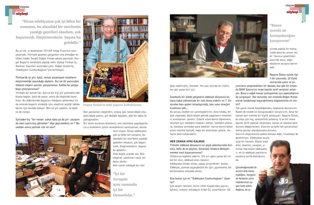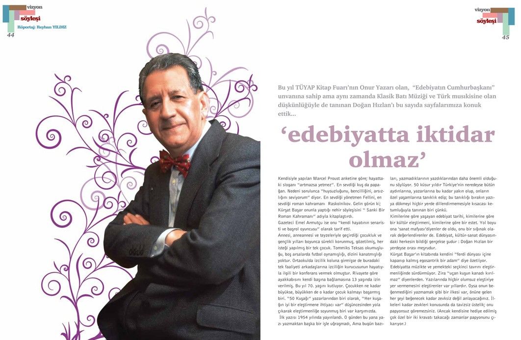 Bu yıl 25. si düzenlenen TÜYAP Kitap Fuarı’nın onur yazarıydı. Hürriyet gazetesi çalışanları ona armağan ettikleri kitabı Sevgili Doğan Hızlan adıyla yayınladı. Kürşat Başar’ın kendisiyle yaptığı nehir söyleşi Türkiye İş Bankası Yayınları arasından çıktı. Doğan Hızlan’la, ‘Edebiyatın Cumhurbaşkanı”yla birlikteyiz