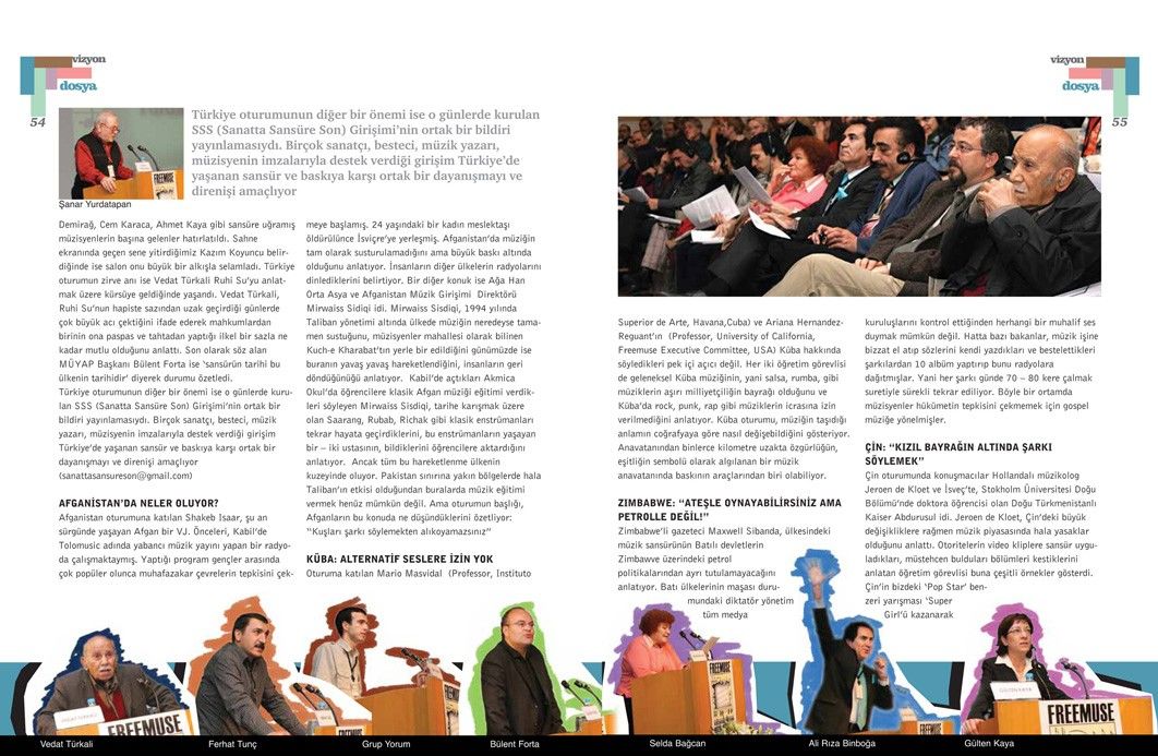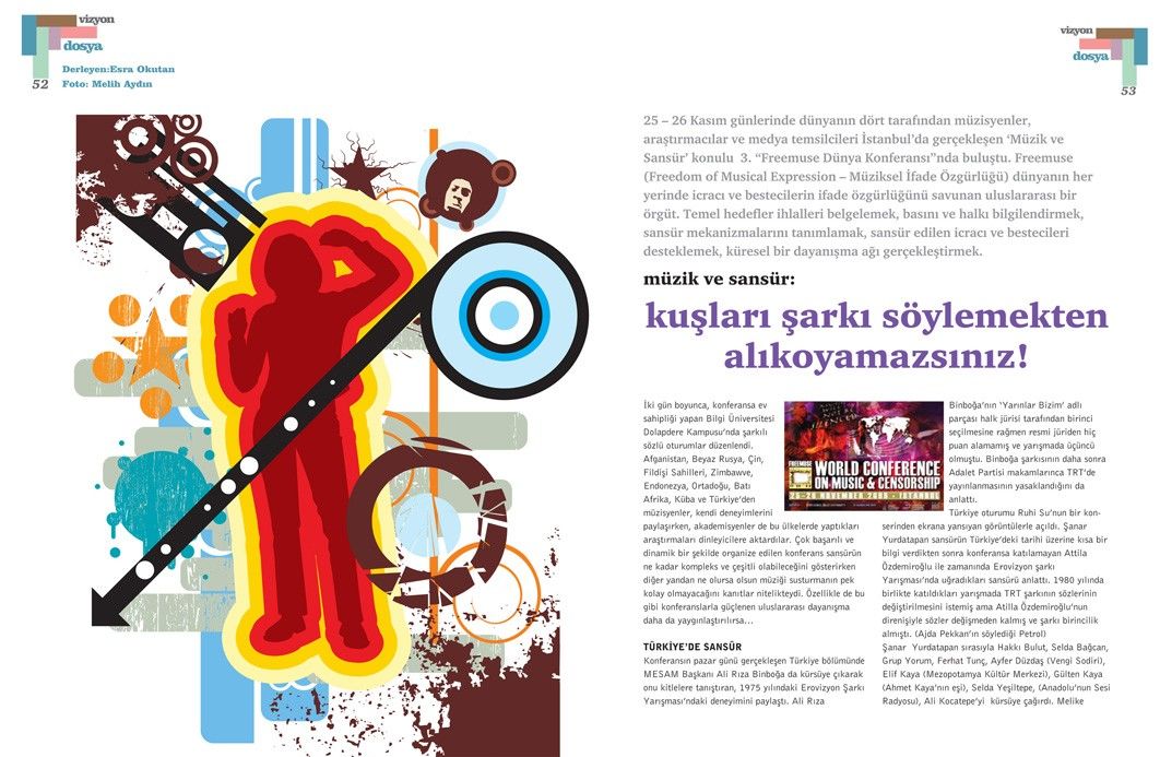 Müzik ve sansür konulu bu haber, Tetra İletişim tarafından, Türkiye Musiki Eseri Sahipleri Meslek Birliği (MESAM) için üretilen “Mesam Vizyon” dergisinin 3. sayısında (Aralık – Ocak 2007) yer aldı. Esra Okutan’ın izleyip yazdığı bu haberin fotoğraflarını Melih Aydın çekti. Sayfa tasarımı ve uygulaması Didem İncesağır tarafından yapıldı.