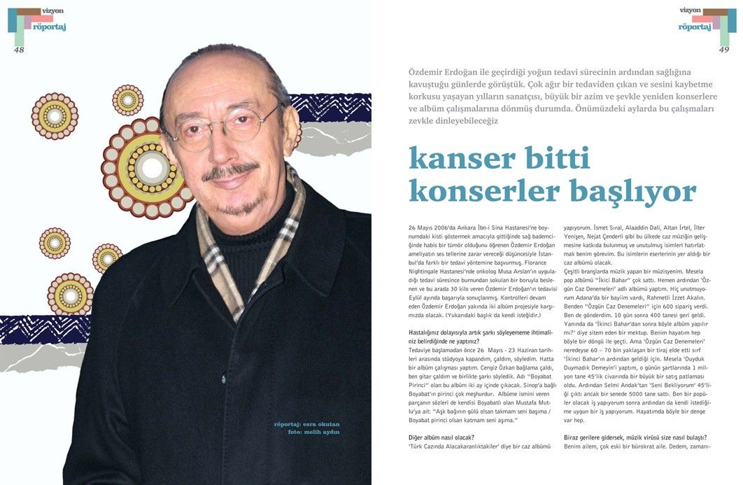 Özdemir Erdoğan’la yapılan bu söyleşi, Tetra İletişim tarafından, Türkiye Musiki Eseri Sahipleri Meslek Birliği (MESAM) için üretilen “Mesam Vizyon” dergisinin 4. sayısında (Nisan – Mayıs 2007) yer aldı. Esra Okutan tarafından gerçekleştirilen söyleşinin fotoğraflarını Melih Aydın çekti. Sayfa tasarımı ve uygulaması Didem İncesağır tarafından yapıldı.