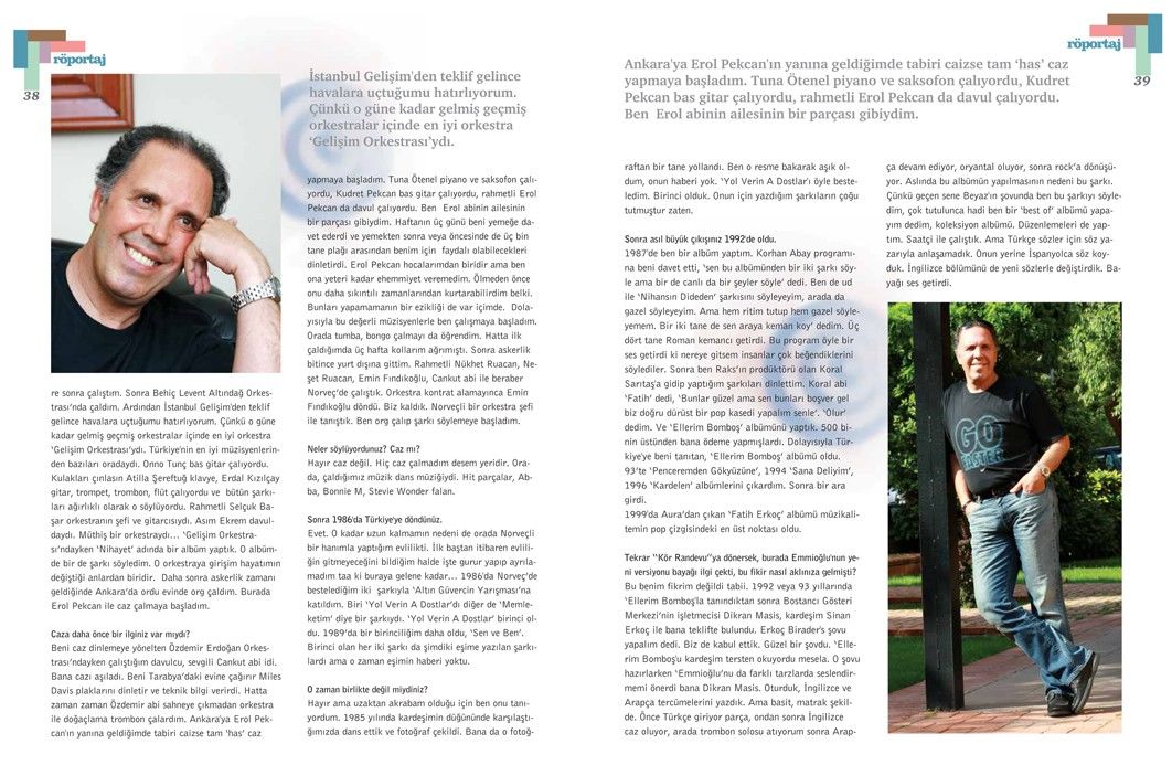Beni caz dinlemeye yönelten Özdemir Erdoğan Orkestrası’ndayken çalıştığım davulcu, sevgili Cankut abi idi. Bana cazı aşıladı. Beni Tarabya’daki evine çağırır Miles Davis plaklarını dinletir ve teknik bilgi verirdi. Hatta zaman zaman Özdemir abi sahneye çıkmadan orkestra ile doğaçlama trombon çalardım. Ankara’ya Erol Pekcan’ın yanına geldiğimde tabiri caizse tam ‘has’ caz yapmaya başladım. Tuna Ötenel piyano ve saksofon çalıyordu, Kudret Pekcan bas gitar çalıyordu, rahmetli Erol Pekcan da davul çalıyordu. Ben Erol abinin ailesinin bir parçası gibiydim. Haftanın üç günü beni yemeğe davet ederdi ve yemekten sonra veya öncesinde de üç bin tane plağı arasından benim için faydalı olabilecekleri dinletirdi. Erol Pekcan hocalarımdan biridir ama ben ona yeteri kadar ehemmiyet veremedim. Ölmeden önce onu daha sıkıntılı zamanlarından kurtarabilirdim belki. Bunları yapamamanın bir ezikliği de var içimde. Dolayısıyla bu değerli müzisyenlerle ben çalışmaya başladım. Orada tumba, bongo çalmayı da öğrendim. Hatta ilk çaldığımda üç hafta kollarım ağrımıştı. Sonra askerlik bitince yurt dışına gittim. Rahmetli Nükhet Ruacan, Neşet Ruacan, Emin Fındıkoğlu, Cankut abi ile beraber Norveç’de çalıştık. Orkestra kontrat alamayınca Emin Fındıkoğlu döndü. Biz kaldık. Norveçli bir orkestra şefi ile tanıştık. Ben org çalıp şarkı söylemeye başladım.