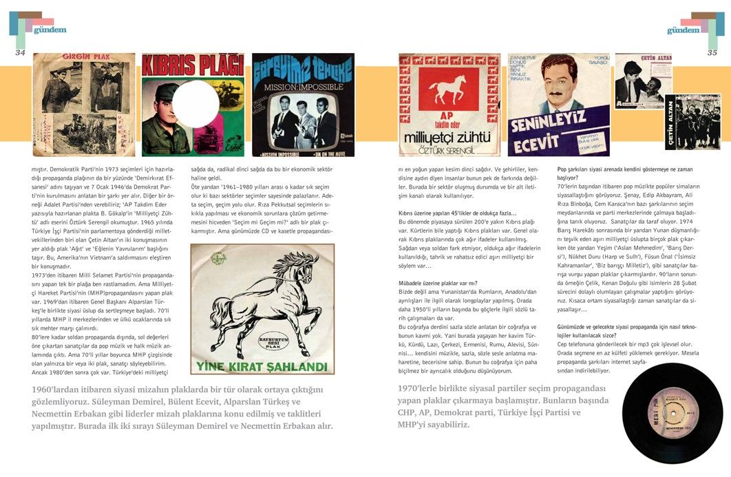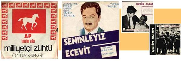 1970’lerle birlikte siyasal partiler seçim propagandası yapan plaklar çıkarmaya başlamıştır. Bunların başında CHP, Adalet Partisi, Demokrat parti, Türkiye İşçi Partisi ve Milliyetçi Hareket Partisi’ni sayabiliriz. CHP’nin hazırlattığı bir yüzünde şarkısı, bir yüzünde şiiri olan ‘Ak Günlere’ plağı seçim meydanlarında sıklıkla çalınmıştır. Demokratik Parti’nin 1973 seçimleri için hazırladığı propaganda plağının da bir yüzünde ‘Demirkırat Efsanesi’ adını taşıyan ve 7 Ocak 1946’da Demokrat Parti’nin kurulmasını anlatan bir şarkı yer alır. Diğer bir örneği Adalet Partisi’nden verebiliriz; ‘AP Takdim Eder yazısıyla hazırlanan plakta B. Gökalp’in ‘Milliyetçi Zühtü’ adlı eserini Öztürk Serengil okumuştur. 1965 yılında Türkiye İşçi Partisi’nin parlamentoya gönderdiği milletvekillerinden biri olan Çetin Altan’ın iki konuşmasının yer aldığı plak ‘Ağıt’ ve ‘Eğlenin Yavrularım’ başlığını taşır. Bu, Amerika’nın Vietnam’a saldırmasını eleştiren bir konuşmadır. 1973’den itibaren Milli Selamet Partisi’nin propagandasını yapan tek bir plağa ben rastlamadım. Ama Milliyetçi Hareket Partisi’nin (MHP)propagandasını yapan plak var. 1969’dan itibaren Genel Başkanı Alparslan Türkeş’le birlikte siyasi üslup da sertleşmeye başladı. 70’li yıllarda MHP il merkezlerinden ve ülkü ocaklarında sık sık mehter marşı çalınırdı. 80’lere kadar soldan propaganda dışında, sol değerleri öne çıkartan sanatçılar da pop müzik ve halk müzik anlamında çıktı. Ama 70’li yıllar boyunca MHP çizgisinde olan yalnızca bir veya iki plak, sanatçı söyleyebilirim. Ancak 1980’den sonra çok var. Türkiye’deki milliyetçi sağda da, radikal dinci sağda da bu bir ekonomik sektör haline geldi. Öte yandan ‘1961–1980 yılları arası o kadar sık seçim olur ki bazı sektörler seçimler sayesinde palazlanır. Adeta seçim, geçim yolu olur. Rıza Pekkutsal seçimlerin sıklıkla yapılması ve ekonomik sorunlara çözüm getirmemesini hicveden ‘Seçim mi Geçim mi?’ adlı bir plak çıkarmıştır. Ama günümüzde CD ve kasetle propagandasını en yoğun yapan kesim dinci sağdır. Ve şehirliler, kendisine aydın diyen insanlar bunun pek de farkında değiller. Burada bir sektör oluşmuş durumda ve bir alt iletişim kanalı olarak kullanılıyor.