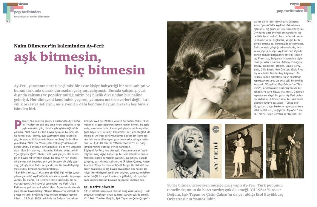 Popüler müziğimizin gerçek divalarından Ay-Feri’yi (ki, “Ayfer”dir asıl adı; ama Fecri Ebcioğlu, o her şeyin mümkün gibi, olabilir gibi göründüğü 60’lı yıllarda, “Gel araya bir tire koyup ayıralım bu ismi; daha havalı olur,” demiş, öyle yapmıştır) genç kuşak çok geç bir saatte, 2003 yılında Odeon ve Sony’nin birlikte yayınladığı “Bak Bir Varmış Bir Yokmuş” albümünde gördü-tanıdı. Sonradan dört albümlük bir seriye ulaşacak olan “Bak Bir Varmış…”ların bu ilkinde, 1968 tarihli “Çal Çingene Çal” (Philips) adlı şarkıyla yer aldı sanatçı; en büyük hit’lerinden biriydi bu ama Ay-Feri müzik dünyamıza çok önceden, çok çok önceden bir giriş yapmış, çok güçlü ve farklı sesiyle de, her türden dinleyiciyi mest etmiş, kendine hayran bırakmıştı.