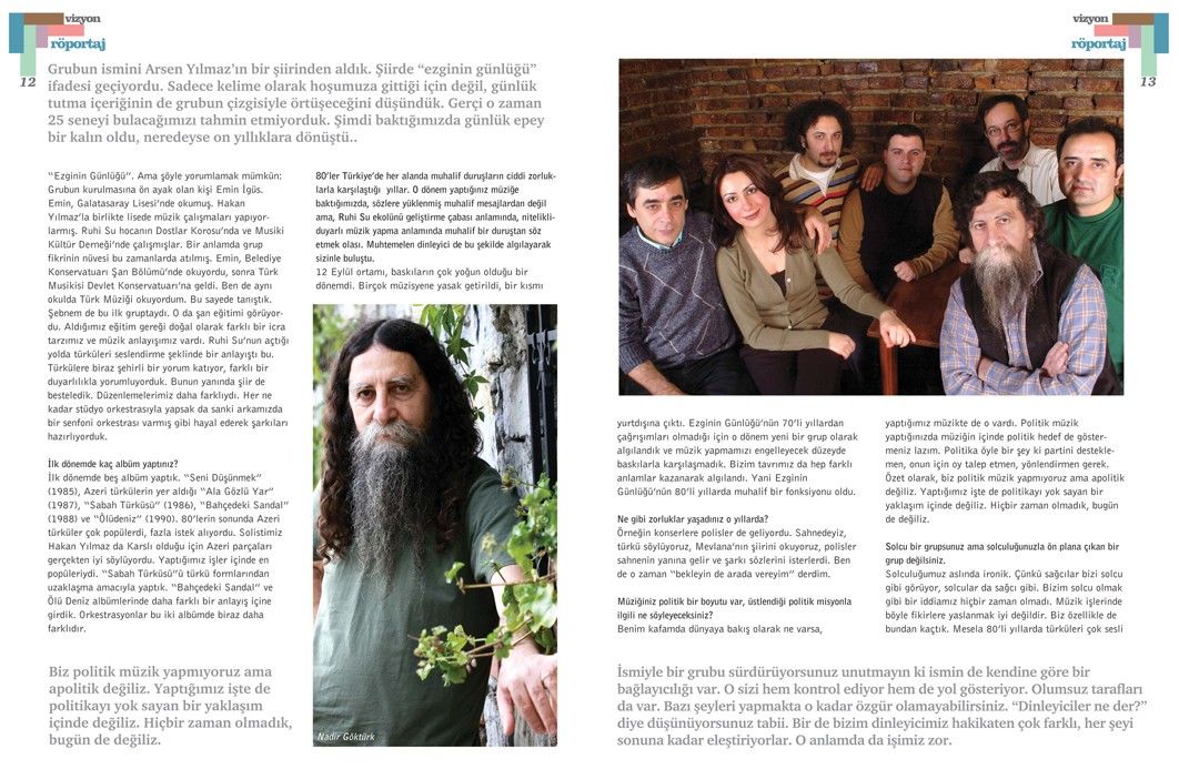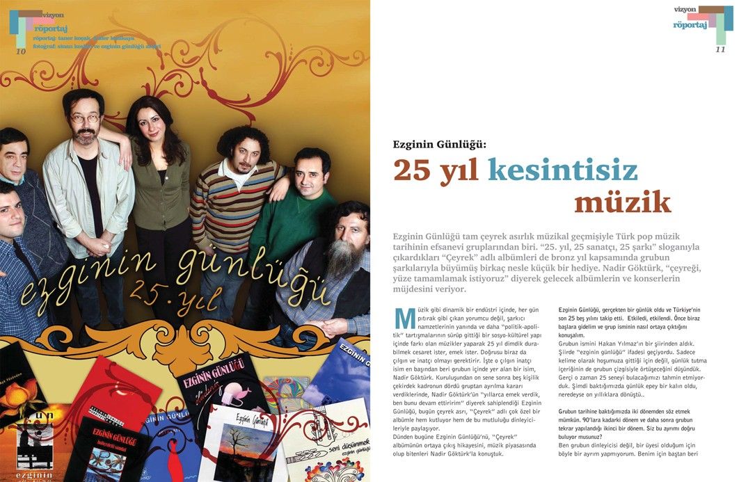 Ezginin Günlüğü’yle yapılan bu söyleşi, Tetra İletişim tarafından, Türkiye Musiki Eseri Sahipleri Meslek Birliği (MESAM) için üretilen “Mesam Vizyon” dergisinin 6. sayısında (Eylül – Ekim 2007) yer aldı. Söyleşi, Taner Koçak ve Önder Kızılkaya tarafından yapıldı. Röportaj fotoğrafları Sinan Kesgin tarafından çekildi. Diğer görseller Ezginin Günlüğü arşivinden edinildi. Sayfa tasarımı ve uygulaması Didem İncesağır tarafından yapıldı.