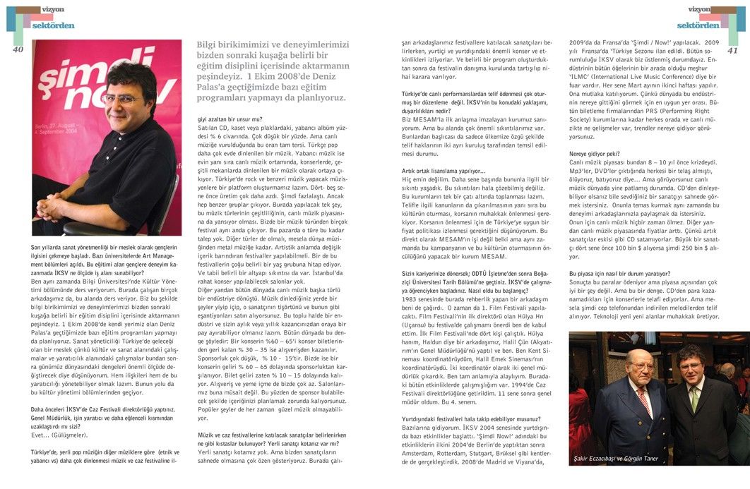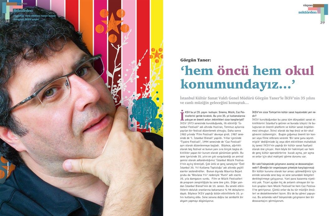 İstanbul Kültür Sanat Vakfı Genel Müdürü Görgün Taner’le yapılan bu söyleşi, Tetra İletişim tarafından, Türkiye Musiki Eseri Sahipleri Meslek Birliği (MESAM) için üretilen “Mesam Vizyon” dergisinin 6. sayısında (Eylül – Ekim 2007) yer aldı. Söyleşi, Taner Koçak ve Esra Okutan tarafından yapıldı. Röportaj fotoğrafları İKSV arşivinden edinildi. Sayfa tasarımı ve uygulaması Didem İncesağır tarafından yapıldı.
