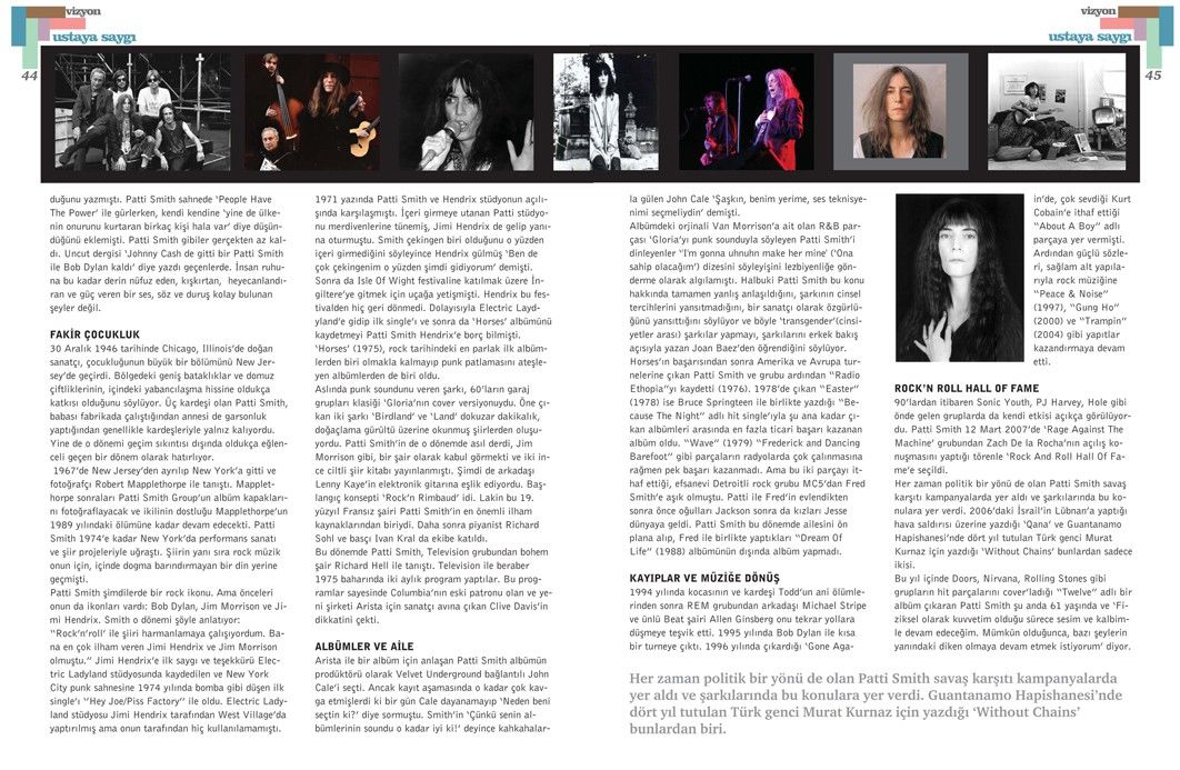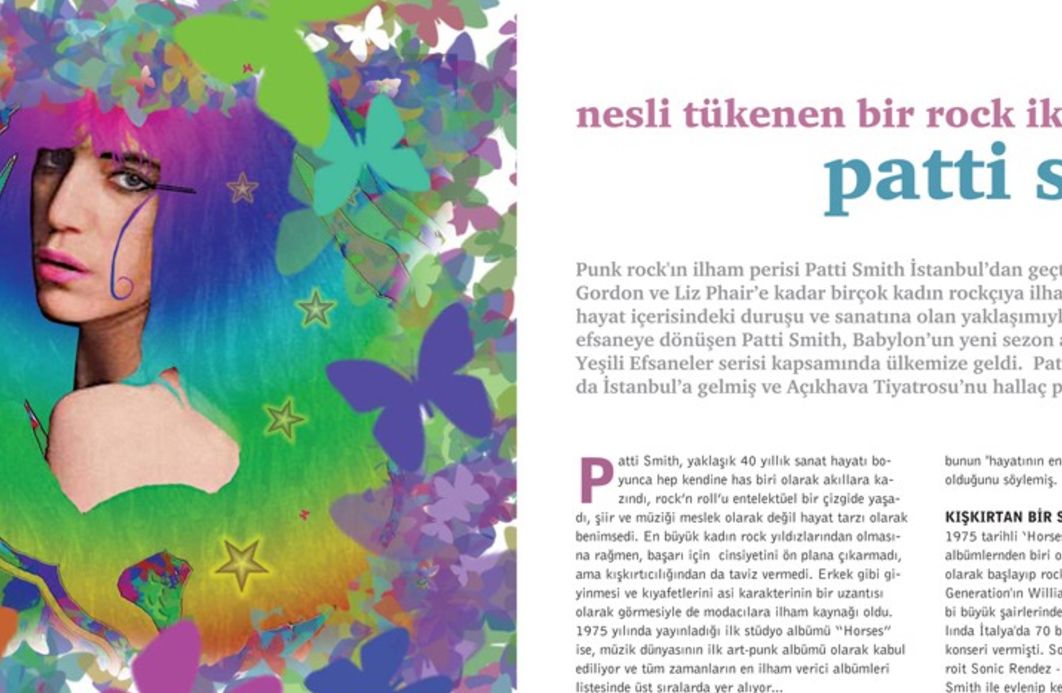 Patti Smith, yaklaşık 40 yıllık sanat hayatı boyunca hep kendine has biri olarak akıllara kazındı, rock’n roll’u entelektüel bir çizgide yaşadı, şiir ve müziği meslek olarak değil hayat tarzı olarak benimsedi. En büyük kadın rock yıldızlarından olmasına rağmen, başarı için cinsiyetini ön plana çıkarmadı, ama kışkırtıcılığından da taviz vermedi. Erkek gibi giyinmesi ve kıyafetlerini asi karakterinin bir uzantısı olarak görmesiyle de modacılara ilham kaynağı oldu. 1975 yılında yayınladığı ilk stüdyo albümü “Horses” ise, müzik dünyasının ilk art-punk albümü olarak kabul ediliyor ve tüm zamanların en ilham verici albümleri listesinde üst sıralarda yer alıyor… Patti Smith daha önce 8 Temmuz 1999 yılında İstanbul Açıkhava Tiyatrosu’nda bir konser vermişti. Herhalde Açıkhava’nın gördüğü en müthiş konserlerden biriydi. Patti Smith parçaları söylerken kendinden geçip ortalığı yıkıp dağıtıyor sonra da hafif şaşkınlıkla seyirciyi selamlıyordu. Etrafa yaydığı enerji o kadar güçlüydü ki… Nitekim Patti Smith’in 1996 yılında Los Angeles’da verdiği konserden sonra REM’den Michael Stipe bunun “hayatının en inanılmaz 10 deneyiminden biri” olduğunu söylemiş.