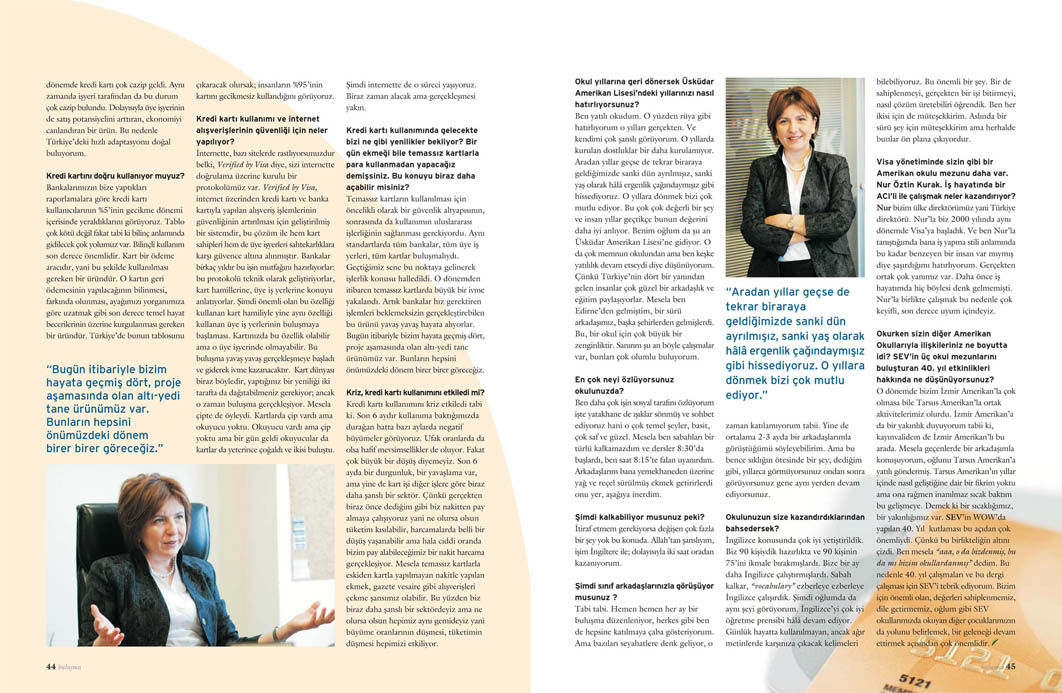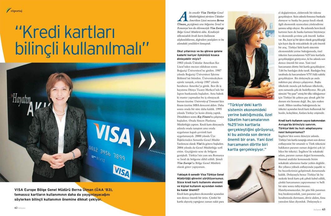 Altı senedir Visa Türkiye Genel Müdürlüğünü yürüten Üsküdar Amerikan Lisesi mezunu Berna Ülman, geçtiğimiz sene bölgesine İsrail ve Romanya’nın da eklenmesiyle Visa Europe Bölge Genel Müdürü oldu. Kendisiyle ülkemizdeki kredi kartı kullanım alışkanlıklarını, doğruları yanlışları ve bu alandaki yenilikleri konuştuk.