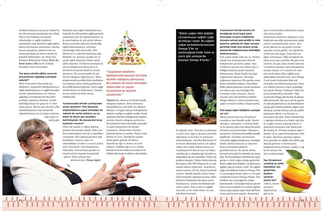 Mesela günümüzde ilaç firmalarının yarattığı üç tane hastalık vardır. Bunlar menopoz, osteoporoz ve kolesteroldür ve bu durumu zaten tüm dünya literatürü de kabul etmiş durumdadır. Menopoz, osteoporoz ve kolesterol kesinlikle hastalık değillerdir. Temeline yani hücresel seviyedeki sağlığa baktığınızda, hastalığın sebebi, ilerleme durumu ve tedavinin bunun üzerindeki etkilerini görebiliyorsunuz. Bu sayede elbette hücresel seviyedeki bozukluklar da ortaya çıktı. Bu bozuklukların sebebinin de yapay gıdalar ve kötü yağlar olduğu gösterildi. Bütün yağlar kötü değildir, vücudumuzun sağlıklı yağa da ihtiyacı vardır. Bu sağlıklı yağlar da balıklarda bulunan Omega 3’ler ve zeytinyağıyla fındık, fıstık ve ceviz gibi yemişlerde bulunan Omega 9’lardır. Esas tehlikeli olan transyağlardır çünkü kanserojendir. Transyağlar hücreye girerek hücre zarına yerleşirler ve normal yağların hücreye giriş çıkışına engel olarak işlevlerini yerine getirmesini engeller. Kanserojen olan ve kolesterolün yükselmesine neden olan durum budur. Yabancıların diyetlerine bakarsanız ceviz fındık gibi yiyecekleri göremezsiniz çünkü onların memleketlerinde yoktur. Ama bizim ülkemiz bu tip gıdalar/ürünler açısından cennet gibidir. Ara öğünlerde yemek için çok uygun. Zaten ben ara öğün vermiyorum. Öğle yemeğinde bir tabak ceviz yiyin yeterlidir. Bir gün ceviz yiyorum, bir gün yaban mersini yiyorum ve bol bol su içiyorum. Ama tabii gençlerin enerjiye ihtiyacı var o yüzden bu onlar için yeterli olmaz fakat sağlıklı yeme alışkanlıkları edinmek lazım. Yani Omega 3 çok önemli dolayısıyla balık çok önemlidir ama balık kızarmayacak. Sonra ton balıkları konserve haline getirildiği için içinde Omega 3 kalmıyor, balık taze ya da dondurulmuş olmalıdır. Tıpkı yumurtada olduğu gibi burada da pişirme şekli çok önemli. Aynı şey et için de geçerli; eti yakarak pişirirseniz ya da Amerikalıların yaptığı gibi barbekü şeklinde yağları ateşe damlayıp yanarak dumanı çıkacak şekilde pişirirseniz elbette o et bozulur ve kanserojen hale gelir. Zaten Amerika’daki o sığırların etlerinin içi o kadar yağ dolu ki o yağlar yanınca transyağ oluyor ve dolayısıyla kanserojen hale dönüyorlar. Bu yüzden de “Kırmızı et kanser yapar.” deniyor. Evet, yapar böyle pişirirsen tabii ki yapar. Ama kuzu pirzolası yapmaz. Kuzu pirzolası en sağlıklı ettir çünkü yağı dışarıda görünür ve istemezseniz bıçağınızla kesip ayırırsınız. Çünkü o yağ henüz kırmızı etin içine yerleşmemiştir.