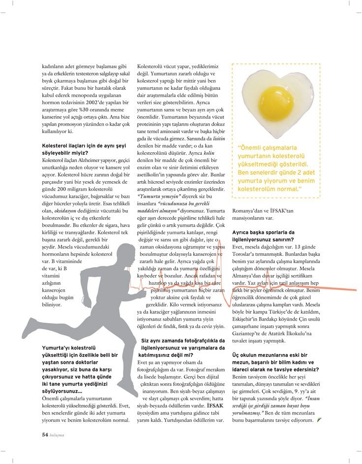 Önemli çalışmalarla yumurtanın kolesterolü yükseltmediği gösterildi. Evet, ben senelerdir günde iki adet yumurta yiyorum ve benim kolesterolüm normal. Kolesterolü vücut yapar, yediklerimiz değil. Yumurtanın zararlı olduğu ve kolesterol yaptığı bir mittir yani ben yumurtanın ne kadar faydalı olduğuna dair araştırmalarla elde edilmiş bütün verileri size gösterebilirim. Ayrıca yumurtanın sarısı ve beyazı ayrı ayrı çok önemlidir. Yumurtanın beyazında vücut proteininin yapı taşlarını oluşturan dokuz tane temel aminoasit vardır ve başka hiçbir gıda ile vücuda girmez. Sarısında da lisitin denilen bir madde vardır; o da kan kolesterolünü düşürür. Ayrıca kolin denilen bir madde de çok önemli bir enzim olan ve sinir iletimini etkileyen asetilkolin’in yapısında görev alır. Bunlar artık hücresel seviyede enzimler üzerinden araştırılarak ortaya çıkarılmış gerçeklerdir. “Yumurta yemeyin” diyerek siz bu insanlara “vücudunuza bu gerekli maddeleri almayın” diyorsunuz. Yumurta eğer aşırı derecede pişirilirse tehlikeli hale gelir çünkü o artık yumurta değildir. Çok pişirildiğinde yumurta katılaşır, rengi değişir ve sarısı un gibi dağılır, işte o zaman oksidasyona uğramıştır ve yapısı bozulmuştur dolayısıyla kanserojen ve zararlı hale gelir. Ayrıca yağda çok yakıldığı zaman da yumurta özelliğini kaybeder ve bozulur. Ancak rafadan ve hazırlop ya da yağda kısa bir süre pişirilmiş yumurtanın hiçbir zararı yoktur aksine çok faydalı ve gereklidir. Kilo vermek istiyorsanız ya da karaciğer yağlarınızın inmesini istiyorsanız sabahları yumurta yiyin öğlenleri de fındık, fıstık ya da ceviz yiyin.