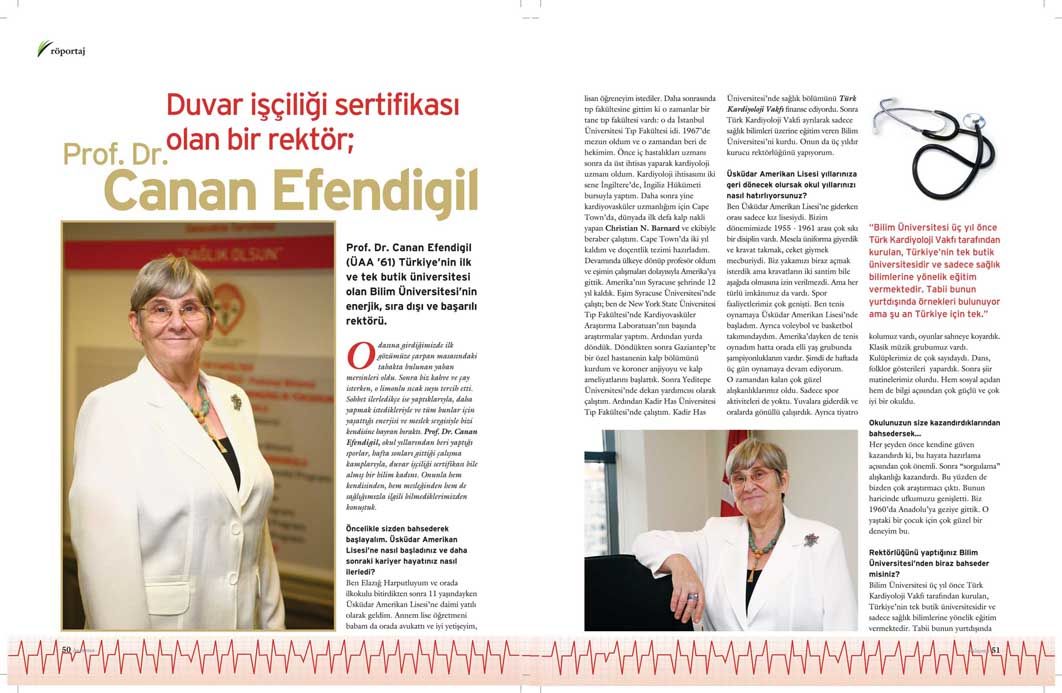 Odasına girdiğimizde ilk gözümüze çarpan masasındaki tabakta bulunan yaban mersinleri oldu. Sonra biz kahve ve çay isterken, o limonlu sıcak suyu tercih etti. Sohbet ilerledikçe ise yaptıklarıyla, daha yapmak istedikleriyle ve tüm bunlar için yaşattığı enerjisi ve meslek sevgisiyle bizi kendisine hayran bıraktı. Prof. Dr. Canan Efendigil, okul yıllarından beri yaptığı sporlar, hafta sonları gittiği çalışma kamplarıyla, duvar işçiliği sertifikası bile almış bir bilim kadını. Onunla hem kendisinden, hem mesleğinden hem de sağlığımızla ilgili bilmediklerimizden konuştuk.