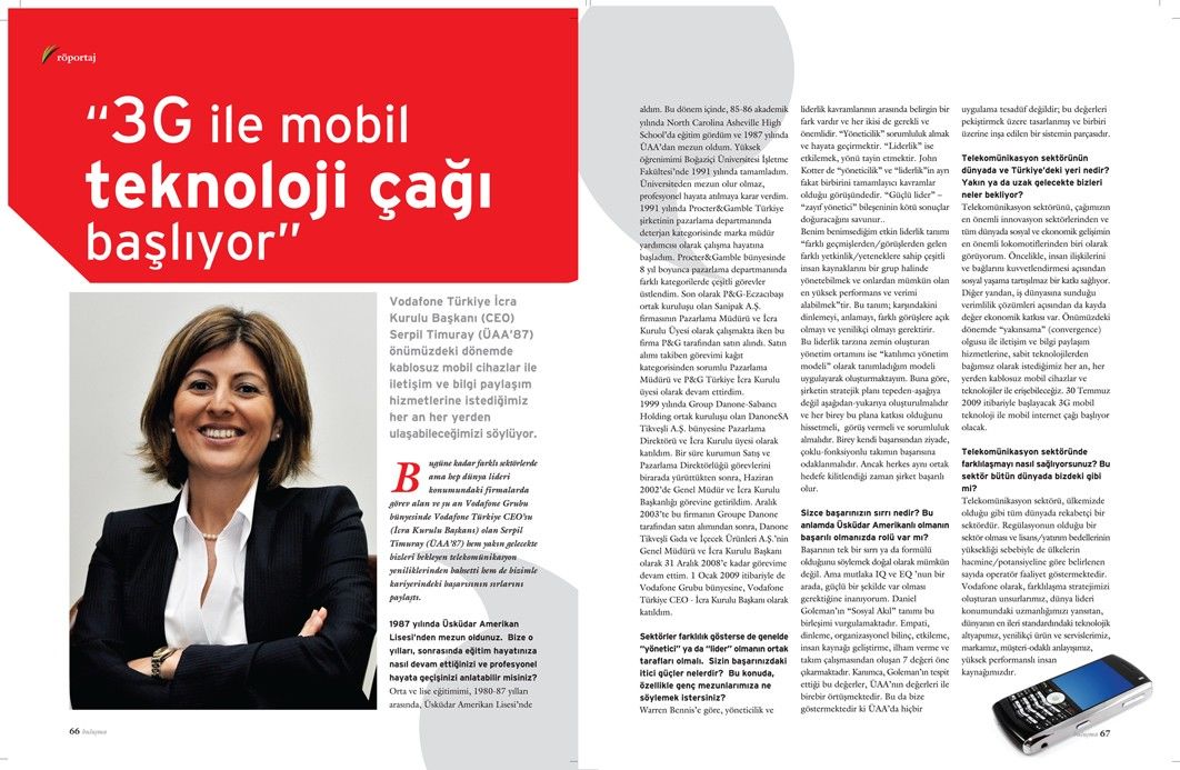 Bugüne kadar farklı sektörlerde ama hep dünya lideri konumundaki firmalarda görev alan ve şu an Vodafone Grubu bünyesinde Vodafone Türkiye CEO’su (İcra Kurulu Başkanı) olan Serpil Timuray (ÜAA’87) hem yakın gelecekte bizleri bekleyen telekomünikasyon yeniliklerinden bahsetti hem de bizimle kariyerindeki başarısının sırlarını paylaştı.