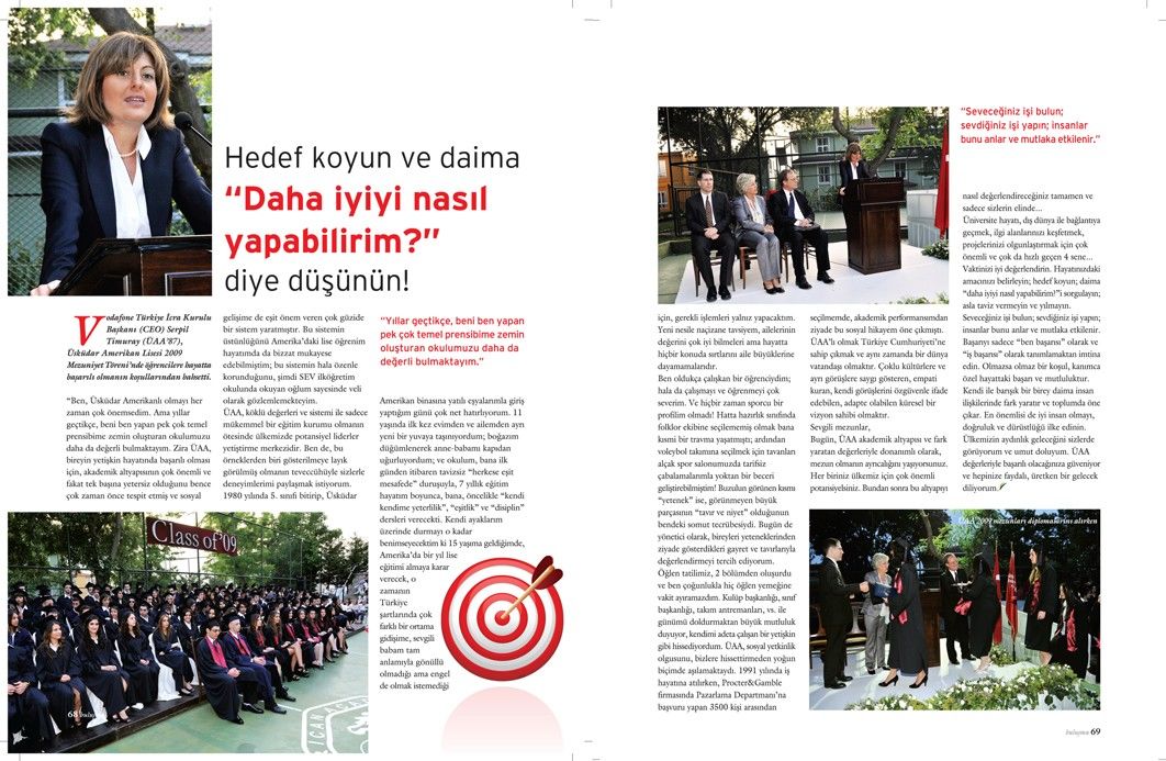 “Ben, Üsküdar Amerikanlı olmayı her zaman çok önemsedim. Ama yıllar geçtikçe, beni ben yapan pek çok temel prensibime zemin oluşturan okulumuzu daha da değerli bulmaktayım. Zira ÜAA, bireyin yetişkin hayatında başarılı olması için, akademik altyapısının çok önemli ve fakat tek başına yetersiz olduğunu bence çok zaman önce tespit etmiş ve sosyal gelişime de eşit önem veren çok güzide bir sistem yaratmıştır. Bu sistemin üstünlüğünü Amerika’daki lise öğrenim hayatımda da bizzat mukayese edebilmiştim; bu sistemin hala özenle korunduğunu, şimdi SEV ilköğretim okulunda okuyan oğlum sayesinde veli olarak gözlemlemekteyim.