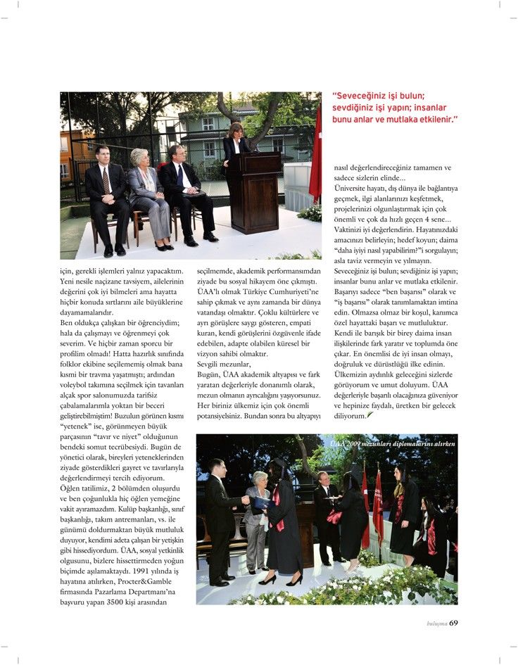 Seveceğiniz işi bulun; sevdiğiniz işi yapın; insanlar bunu anlar ve mutlaka etkilenir. Başarıyı sadece “ben başarısı” olarak ve “iş başarısı” olarak tanımlamaktan imtina edin. Olmazsa olmaz bir koşul, kanımca özel hayattaki başarı ve mutluluktur. Kendi ile barışık bir birey daima insan ilişkilerinde fark yaratır ve toplumda öne çıkar. En önemlisi de iyi insan olmayı, doğruluk ve dürüstlüğü ilke edinin. Ülkemizin aydınlık geleceğini sizlerde görüyorum ve umut doluyum. ÜAA değerleriyle başarılı olacağınıza güveniyor ve hepinize faydalı, üretken bir gelecek diliyorum.