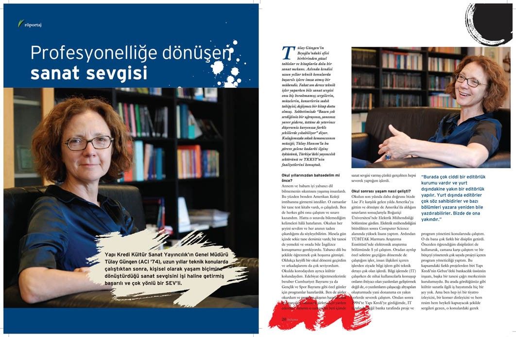 Tülay Güngen’le yapılan bu söyleşi, Tetra İletişim tarafından, Sağlık ve Eğitim Vakfı (SEV) için üretilen “Buluşma” dergisinin 2. sayısında (Eylül 2009) yer aldı. Şebnem Akçıl tarafından gerçekleştirilen söyleşinin fotoğrafları Sinan Kesgin tarafından çekildi. Sayfa tasarımı ve uygulaması Nur Ayman Çakmak ve Orçun Peköz tarafından yapıldı.