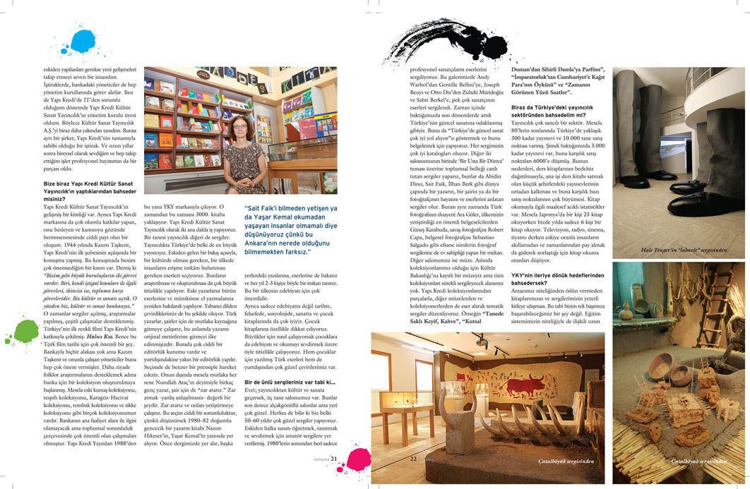 Yapı Kredi Kültür Sanat Yayıncılık’ın gelişmiş bir kimliği var. Ayrıca Yapı Kredi markasına da çok olumlu katkılar yapan, onu besleyen ve kamuoyu gözünde benimsenmesinde ciddi payı olan bir oluşum. 1944 yılında Kazım Taşkent, Yapı Kredi’nin ilk şubesinin açılışında bir konuşma yapmış. Bu konuşmada benim çok önemsediğim bir kısım var. Demiş ki “Bizim gibi büyük kuruluşların iki görevi vardır. Biri, kendi iştigal konuları ile ilgili görevleri, ikincisi ise, topluma karşı görevleridir. Biz kültür ve sanatı seçtik. O yüzden biz, kültür ve sanat bankasıyız.” O zamanlar sergiler açılmış, araştırmalar yapılmış, çeşitli çalışmalar desteklenmiş. Türkiye’nin ilk renkli filmi Yapı Kredi’nin katkısıyla çekilmiş: Halıcı Kız. Bence bu Türk film tarihi için çok önemli bir şey. Bankayla hiçbir alakası yok ama Kazım Taşkent ve onunla çalışan yöneticiler buna hep çok önem vermişler. Daha ziyade folklor araştırmalarını desteklemek adına banka için bir koleksiyon oluşturulmaya başlanmış. Mesela eski kumaş koleksiyonu, tespih koleksiyonu, Karagöz-Hacivat koleksiyonu, tombak koleksiyonu ve sikke koleksiyonu gibi birçok koleksiyonumuz vardır. Bankanın ana faaliyet alanı ile ilgisi olamayacak ama toplumsal sorumluluk çerçevesinde çok önemli olan çalışmaları olmuştur. Yapı Kredi Yayınları 1988’den bu yana YKY markasıyla çıkıyor. O zamandan bu zamana 3000. kitaba yaklaşıyor. Yapı Kredi Kültür Sanat Yayıncılık olarak iki ana dalda iş yapıyoruz. Bir tanesi yayıncılık diğeri de sergiler. Yayıncılıkta Türkiye’de belki de en büyük yayıncıyız. Eskiden gelen bir bakış açısıyla, bir kültürde olması gereken, bir ülkede insanların erişme imkânı bulunması gereken eserleri seçiyoruz. Bunların araştırılması ve oluşturulması da çok büyük titizlikle yapılıyor. Eski yazarların bütün eserlerine ve mümkünse el yazmalarına yeniden bakılarak yapılıyor. Yabancı dilden çevirdiklerimiz de bu şekilde oluyor. Türk yazarlar, şairler için de mutlaka kaynağına gitmeye çalışırız, bu anlamda yazarın orijinal metinlerine gitmeyi ilke edinmişizdir. Burada çok ciddi bir editörlük kurumu vardır ve yurtdışındakine yakın bir editörlük yapılır. Seçimde de benzer bir prensiple hareket ederiz. Onun dışında mesela mutlaka her sene Nurullah Ataç’ın deyimiyle birkaç genç yazar, şair için de “zar atarız.” Zar atmak -yanlış anlaşılmasın- değerli bir şeydir. Zar atarız ve onları yetiştirmeye çalışırız. Bu seçim ciddi bir sorumluluktur, çünkü düşünürsek 1980–82 doğumlu gencecik bir yazarın kitabı Nazım Hikmet’in, Yaşar Kemal’in yanında yer alıyor. Önce dergimizde yer alır, başka yerlerdeki yazılarına, eserlerine de bakarız ve her yıl 2-3 kişiye böyle bir imkan tanırız. Bu bir ülkenin edebiyatı için çok önemlidir. Ayrıca sadece edebiyatta değil tarihte, felsefede, sosyolojide, sanatta ve çocuk kitaplarında da çok iyiyiz. Çocuk kitaplarına özellikle dikkat ediyoruz. Büyükler için nasıl çalışıyorsak çocuklara da edebiyatı ve okumayı sevdirmek üzere öyle titizlikle çalışıyoruz. Hem çocuklar için yazılmış Türk eserleri hem de yurtdışından çok güzel çevirilerimiz var.