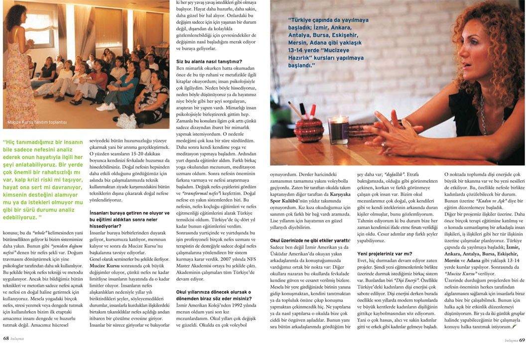 Ben mimarlık okurken hatta okumadan önce de bu tip ruhani ve metafizikle ilgili kitaplar okuyordum; insan psikolojisiyle çok ilgiliydim. Neden böyle hissediyoruz, neden böyle düşünüyoruz ya da hayatımız niye böyle gibi her şeyi sorgulayan, araştıran bir yapım vardı. Mimarlığı insan psikolojisiyle birleştirerek gittim hep. Zamanla bu konulara ilgim çok arttı çünkü sadece dizayndan ibaret bir mimarlık yapmak istemiyordum. O nedenle mesleğimi çok kısa bir süre sürdürdüm. Daha sonra kendi kendime yoga ve meditasyon yapmaya başladım. Ardından yurt dışında eğitimler aldım. Farklı birkaç yoga okulundan mezunum, meditasyon uzmanı oldum. Sonra nefesin öneminin farkına varmaya ve nefesi araştırmaya başladım. Değişik nefes çeşitlerini gördüm ve “transformal nefes”i keşfettim. Doğal nefese en yakın sistemlerden biri. Bu nefesin, nefes koçluğu eğitimleri ve nefes eğitmenliği eğitimlerini alarak Türkiye temsilcisi oldum. Türkiye’de üç-dört yıl kadar bunun eğitimlerini verdim. Sonrasında yurtiçinde ve yurtdışında bu işin profesyoneli birçok nefes uzmanı ve terapistin de desteğiyle sadece doğal nefes çalışmalarına yönlendiren bir sistem kurmaya karar verdik. 2007 yılında NFS Master Akademisi ortaya bu şekilde çıktı. Akademinin çalışmaları tüm Türkiye’de devam ediyor.