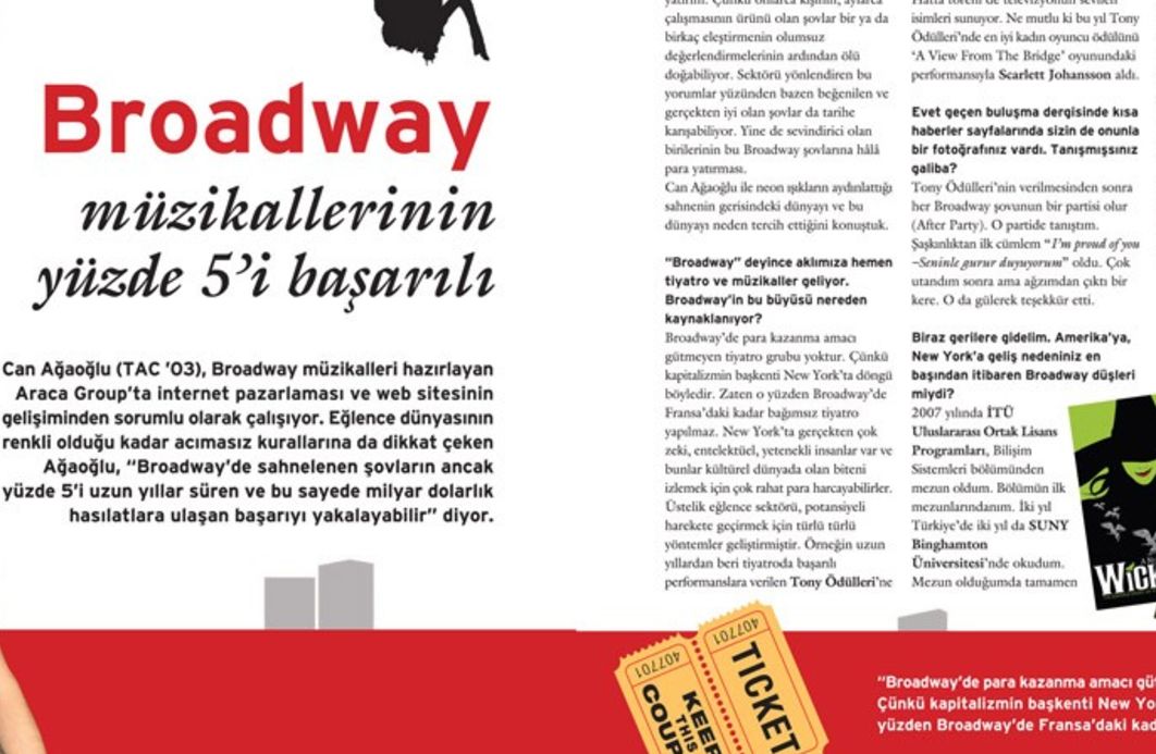 Broadway’de bir müzikal ortalama 15 milyon dolara mâl oluyor. Bu riskli de bir yatırım. Çünkü onlarca kişinin, aylarca çalışmasının ürünü olan şovlar bir ya da birkaç eleştirmenin olumsuz değerlendirmelerinin ardından ölü doğabiliyor. Sektörü yönlendiren bu yorumlar yüzünden bazen beğenilen ve gerçekten iyi olan şovlar da tarihe karışabiliyor. Yine de sevindirici olan birilerinin bu Broadway şovlarına hâlâ para yatırması. Can Ağaoğlu ile neon ışıkların aydınlattığı sahnenin gerisindeki dünyayı ve bu dünyayı neden tercih ettiğini konuştuk.